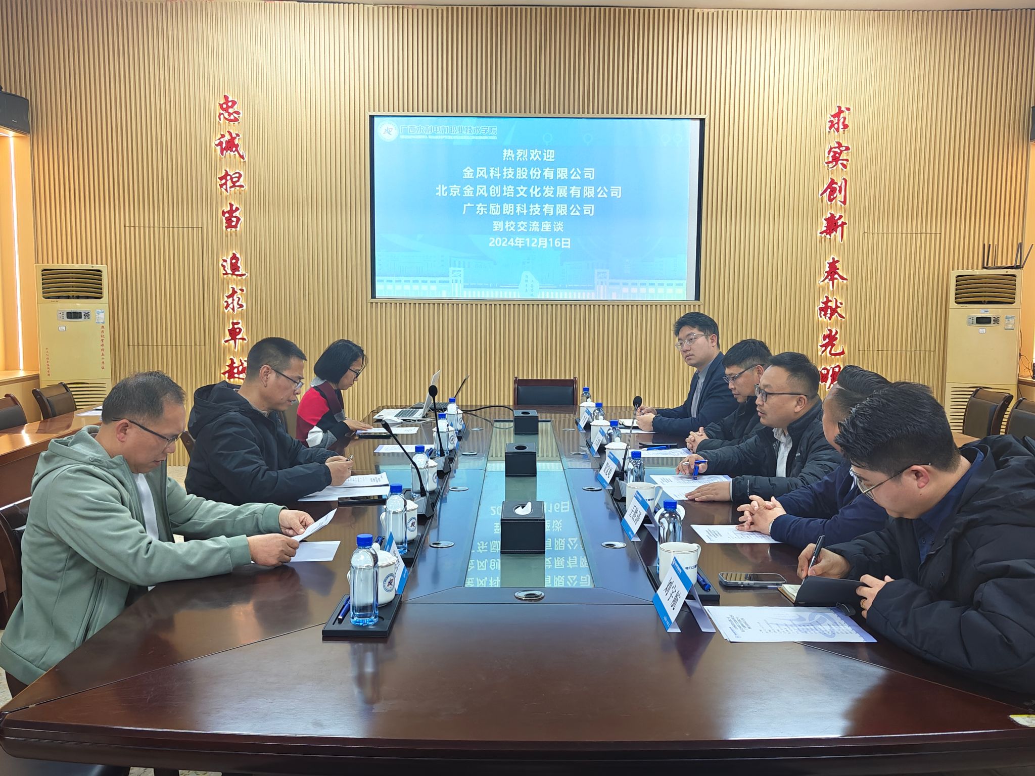 在交流座谈会上,左江林对贺定屹一行的到访表示诚挚的欢迎,并简要介绍了学校整体的发展及学院发展历程、师资力量、科研成果及社会服务等情况。贺定屹对学校的建设发展成果高度赞赏,并介绍了金风科技的发展历程与建设成就。随后双方在新能源专业人才培养模式的创新、人才输送机制的优化、新能源工程产业学院的共建、校企合作的深化等方面进行深入交流、相互促进。