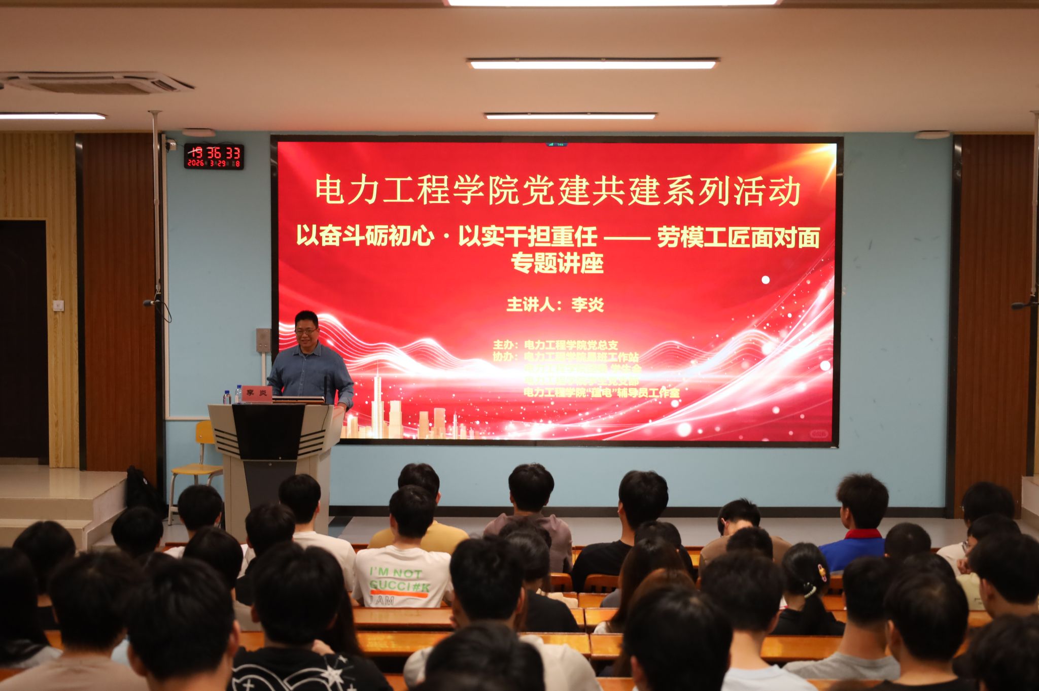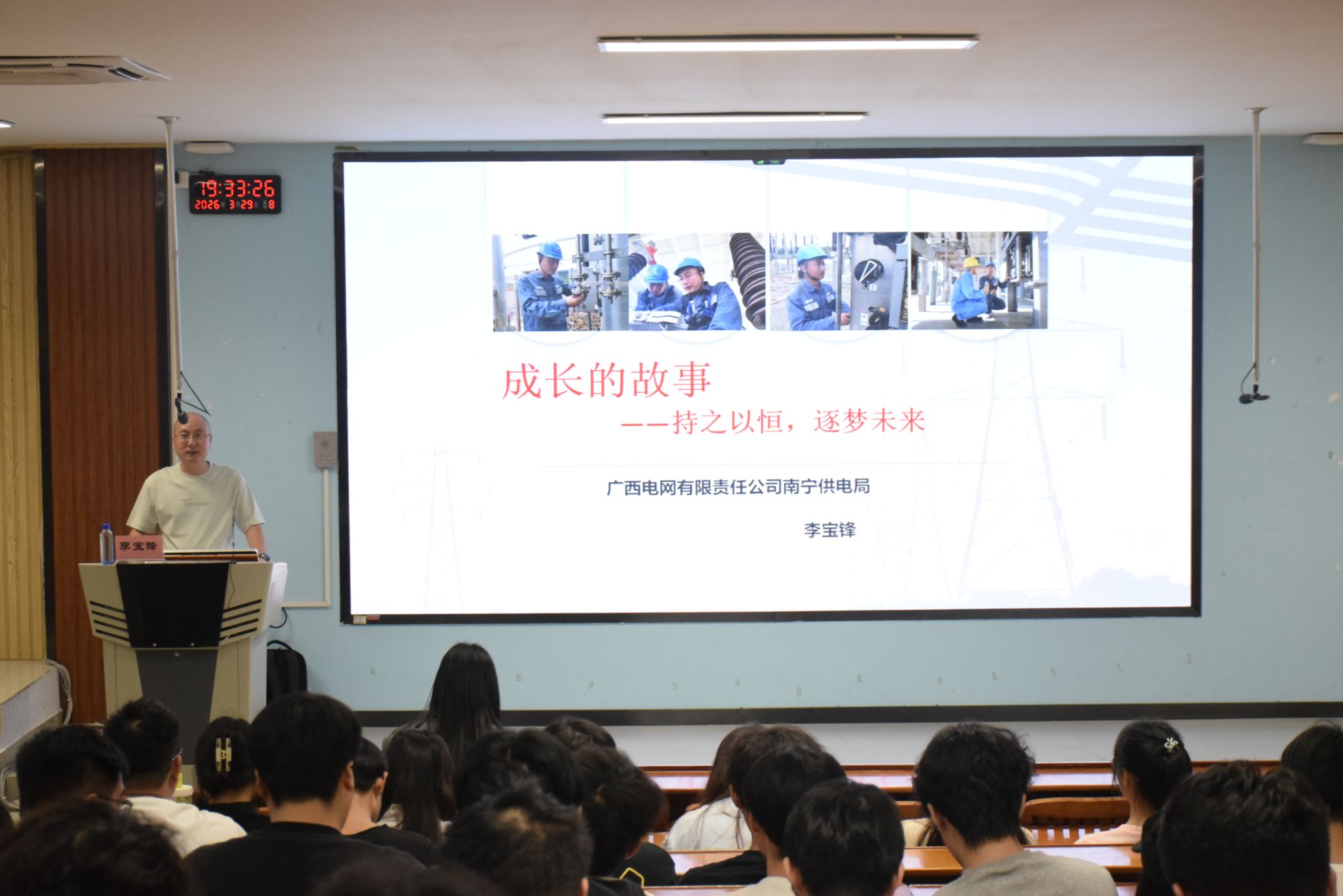 [本网讯]为大力弘扬劳模精神、工匠精神,引导青年学子树立正确的职业理想,3月29日晚,电力工程学院在里建校区教学楼成功开展党建共建系列活动——“匠承初心,电亮未来”劳模工匠面对面专题活动。本次讲座特邀李炎、何位经、李宝锋、廖海铭四位先进典型担任主讲嘉宾,他们曾获“全国五一劳动奖章”“全国技术能手”“广西工匠”“广西劳动模范”“南方电网劳模”等多项荣誉。电力工程学院党总支书记罗宇强出席本次活动,活动由电力工程学院专职组织员赵丹、团委负责人梁克冬、团委副书记徐鑫阳、“蕴电”辅导员工作室主持人丁丽丽主持,2024级、2025级学生到场聆听。