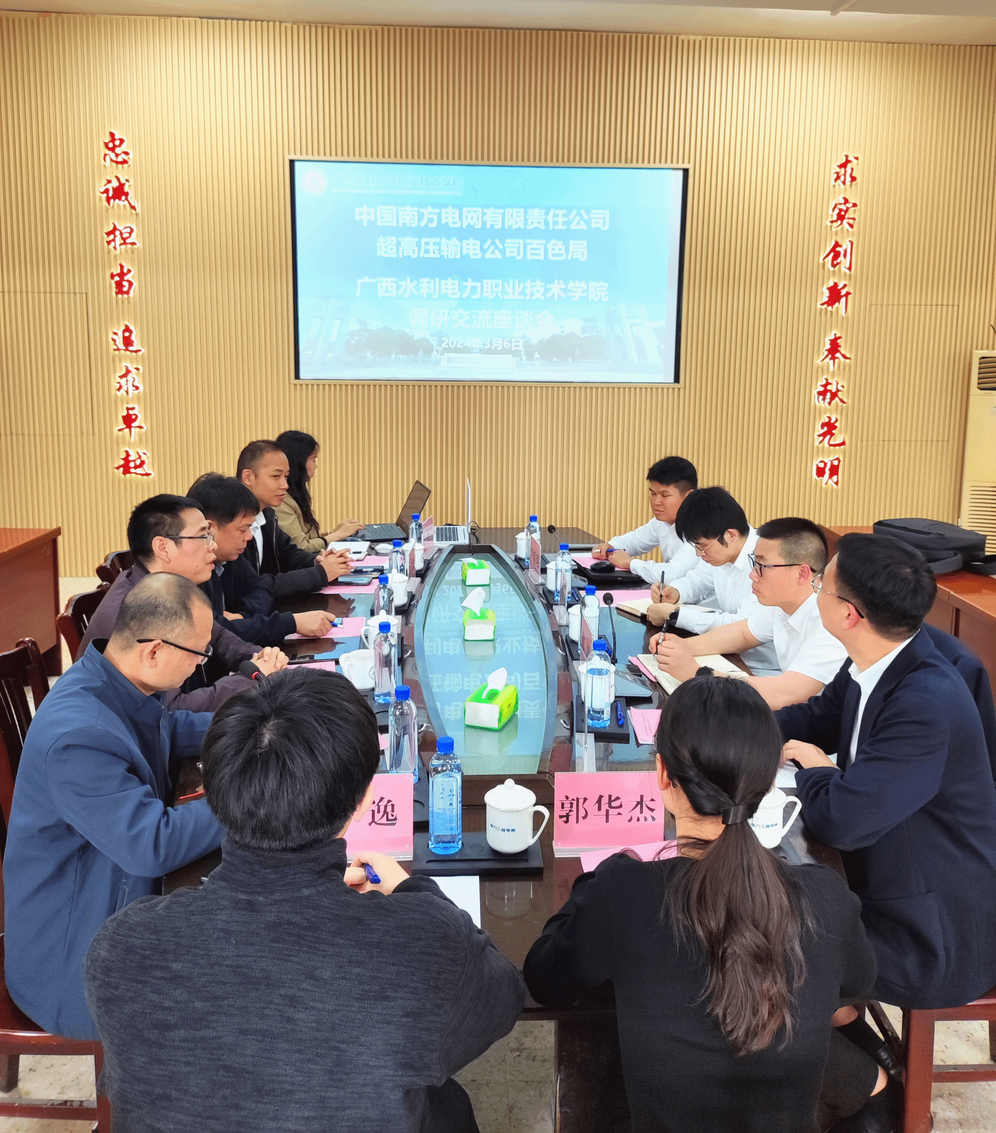 在交流会上,左江林院长对中国南方电网超高压输电公司百色局一行的到来表示热烈欢迎,详细地介绍了学校“双高计划”建设取得的成果,电力类专业设置、人才培养等工作。陈强专责介绍了公司的科研创新等情况,优秀校友卢辉琨做了个人成长汇报。会上双方就产学研合作、科技项目及职创项目合作、科技创新成果申报、电力行业技能证书考证培训、电力行业相关技术标准联合申报等事宜展开交流。