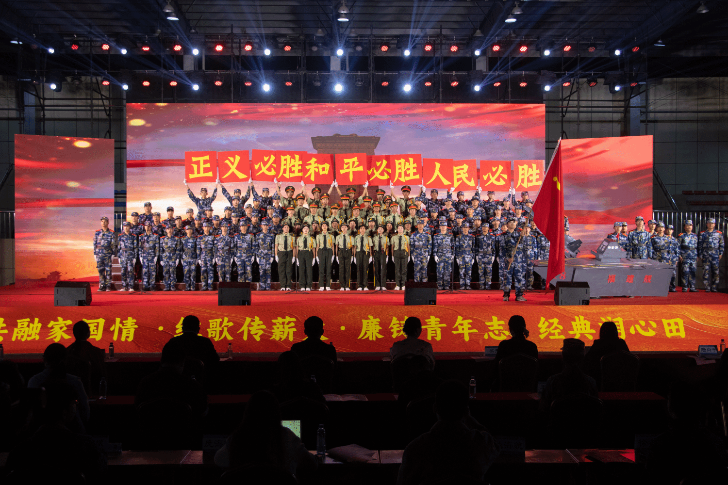 来自各二级学院的11支参赛队伍参加比赛。舞台上,《强军战歌》《保卫黄河》等经典曲目气势磅礴,唱出了迷彩青春的豪迈与担当;《爱我中华》《团结就是力量》等旋律激昂向上,抒发了对伟大祖国和中华民族的无限热爱。配合着深情地朗诵《中国脊梁》《青春中国》《读中国》等篇目,同学们用声音与情感,艺术化地展现了新时代青年铸牢中华民族共同体意识的坚定决心和建设清廉校园的青春承诺。比赛尾声,全场近7000名师生挥舞荧光棒,共同高唱《战歌为胜利唱响》,将现场气氛推向最高潮。运动的星海与磅礴的合唱,汇聚成全体水电学子“请党放心,强国有我”的铮铮誓言。