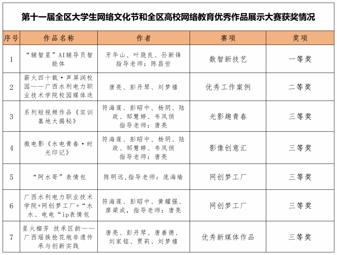 在第十一届全区大学生网络文化节和全区高校网络教育优秀作品展示大赛中,伟德师生团队共计荣获一等奖1项、二等奖1项、三等奖5项。