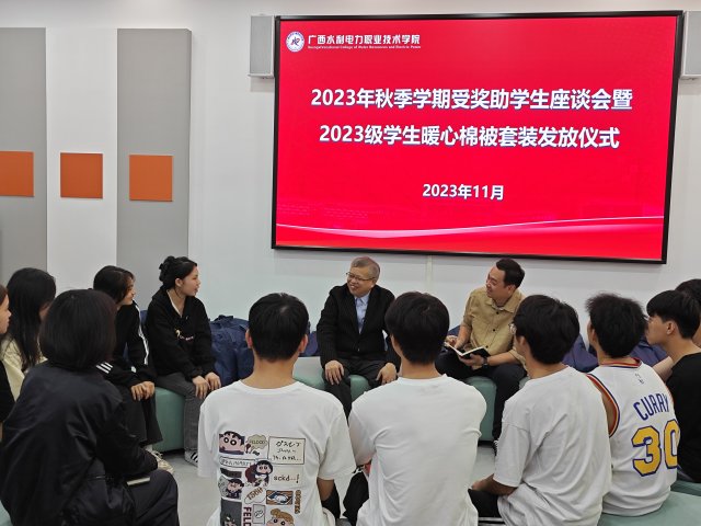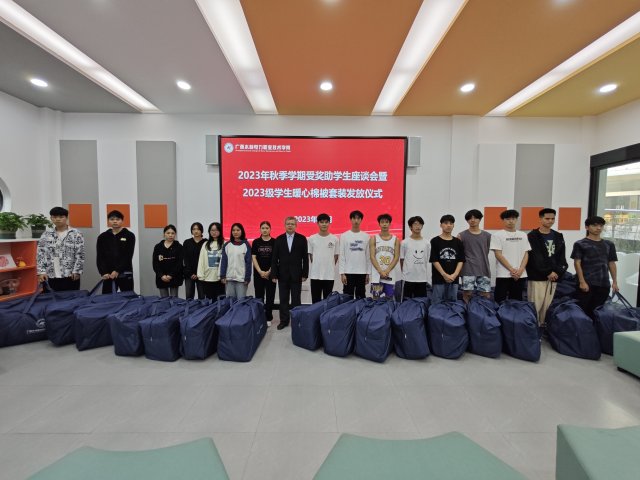 [本网讯]11月29日,学校在长堽校区“一站式”学生社区大厅召开受奖助学生座谈会暨新生暖心棉被套装发放仪式。学校副校长蒋文沛出席活动,学生工作处、二级学院师生代表参加活动。