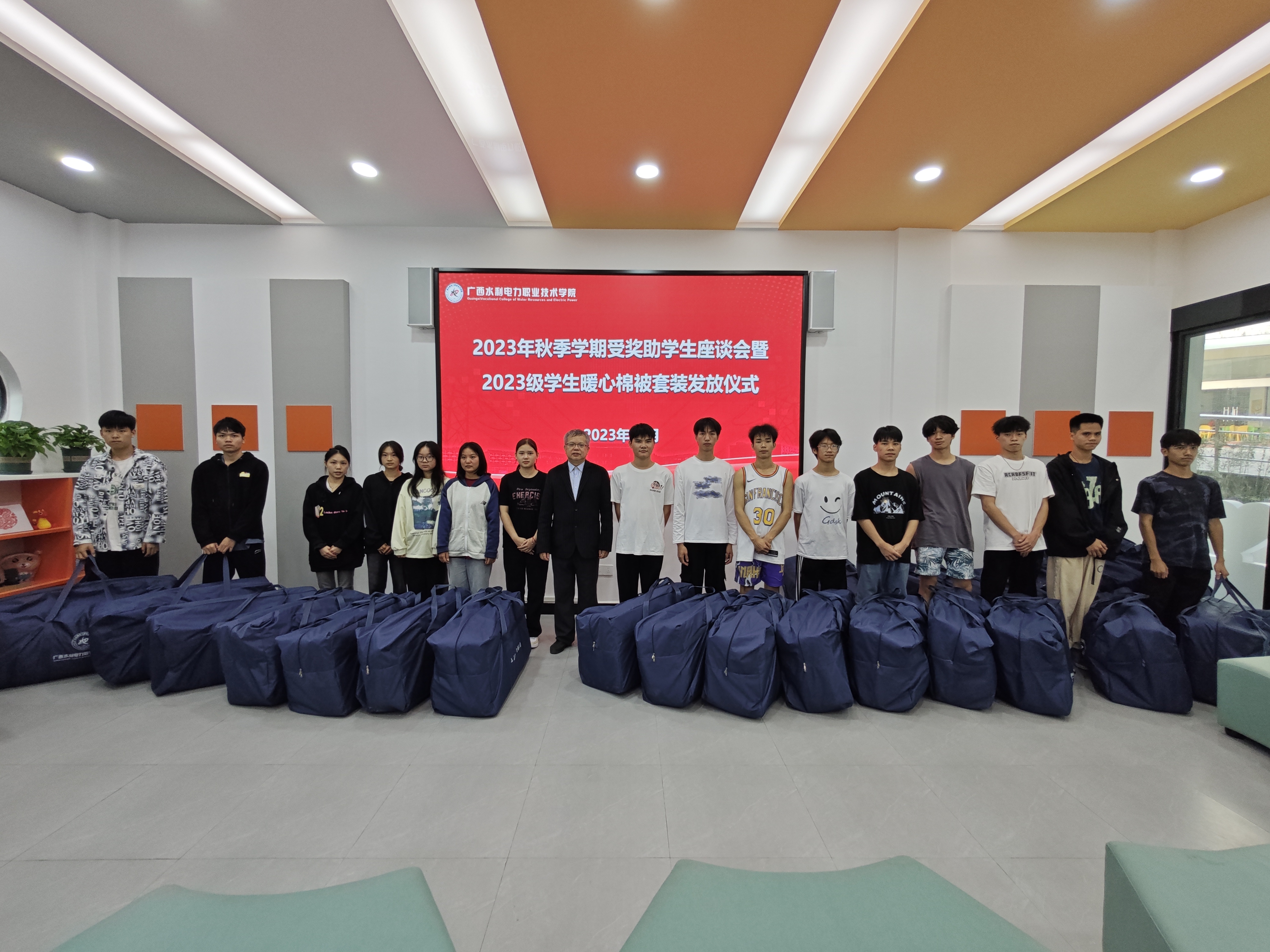 活动最后,蒋文沛副校长和学工处杨骏副处长代表学校给同学们发放暖心棉被套装。1000余套暖心棉被套装已经陆续送到家庭经济困难学生手中,全力保障同学们安心学习,给同学们带去学校的温暖和关爱。