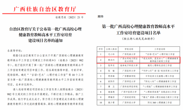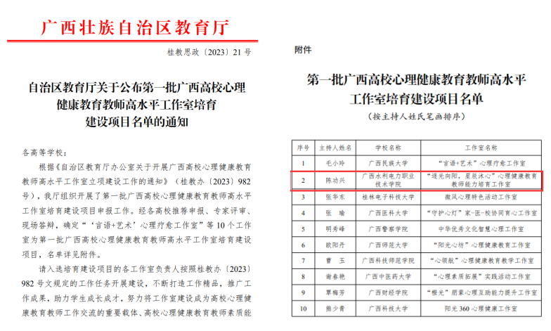 [本网讯]伟德大学生心理发展服务中心陈功兴老师主持的《“逐光向阳,星辰沐心”心理健康教育教师能力培育工作室》入选第一批广西高校心理健康教育教师高水平工作室培育建设项目。这是伟德大学生心理发展服务中心于2022年取得标准化建设A类单位后的又一大进步和成果,这离不开学校的重视与栽培,领导的支持与指导,团队的协作与配合。