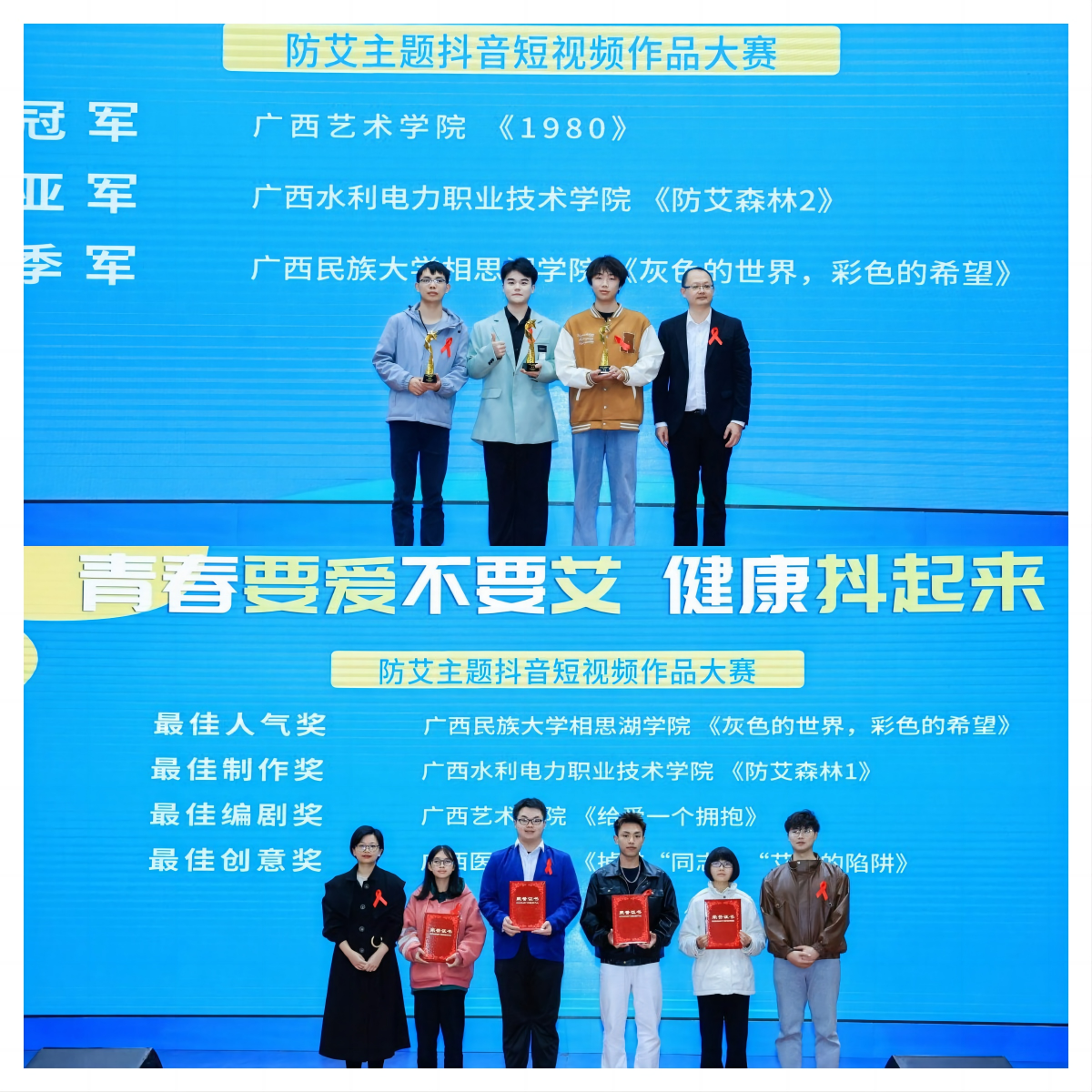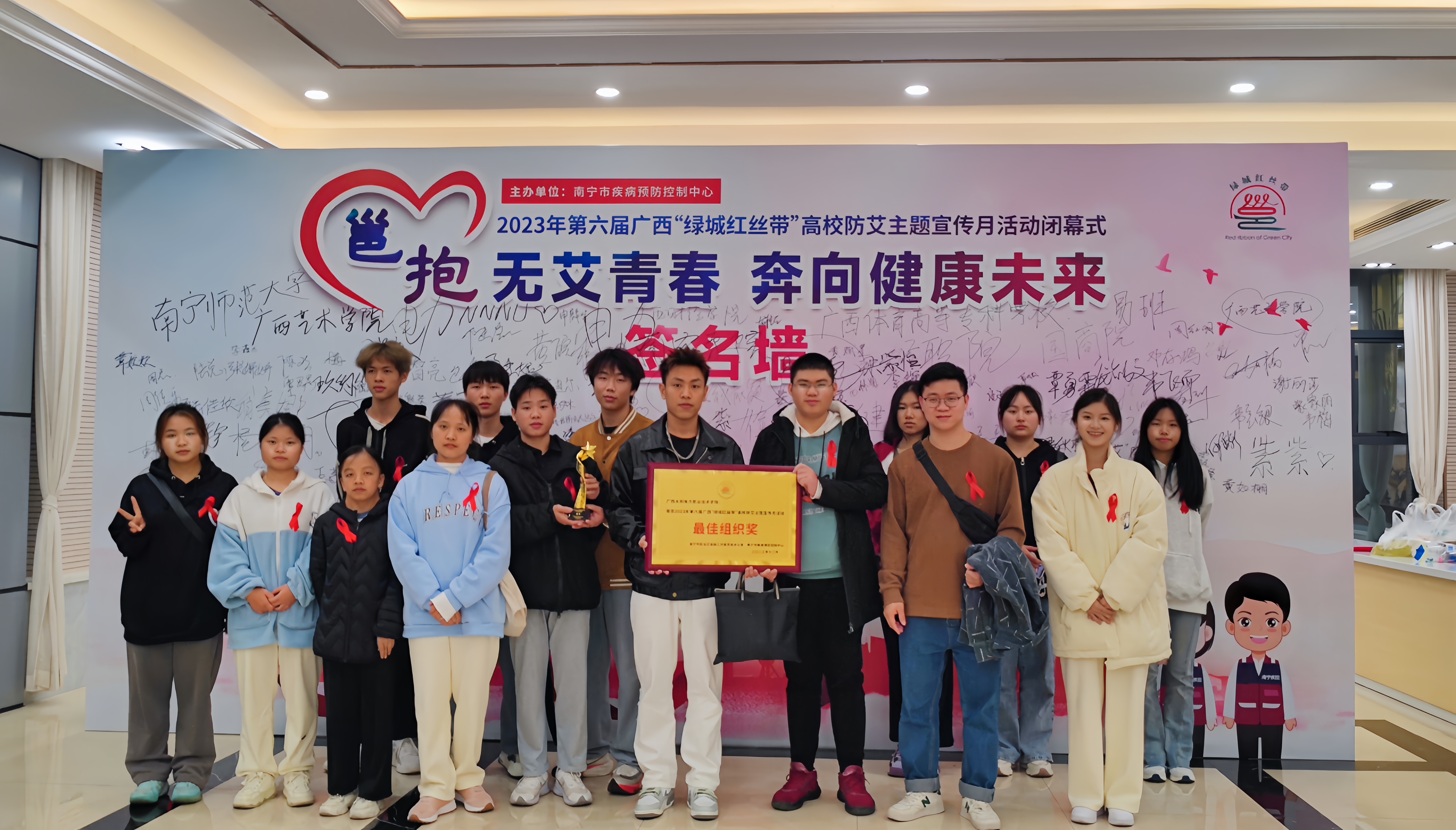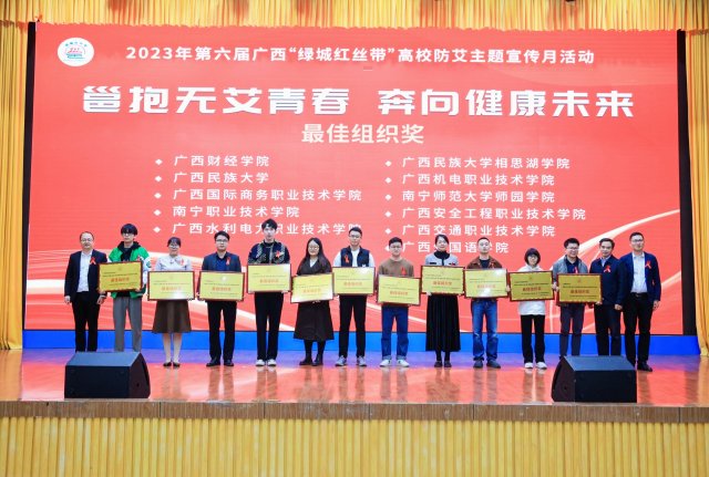 [本网讯]2023年12月6日晚,由南宁市疾病预防控制中心主办的2023年第六届广西“绿城红丝带”高校防艾主题宣传活动总结大会在广西卫生职业技术学院学术报告厅举行。伟德学生工作处罗丹老师带领15名师生参与闭幕式活动。本次活动,伟德荣获“最佳组织奖”,选送的防艾主题抖音短视频作品《防艾森林2》《防艾森林1》分别获得大赛亚军及最佳制作奖。