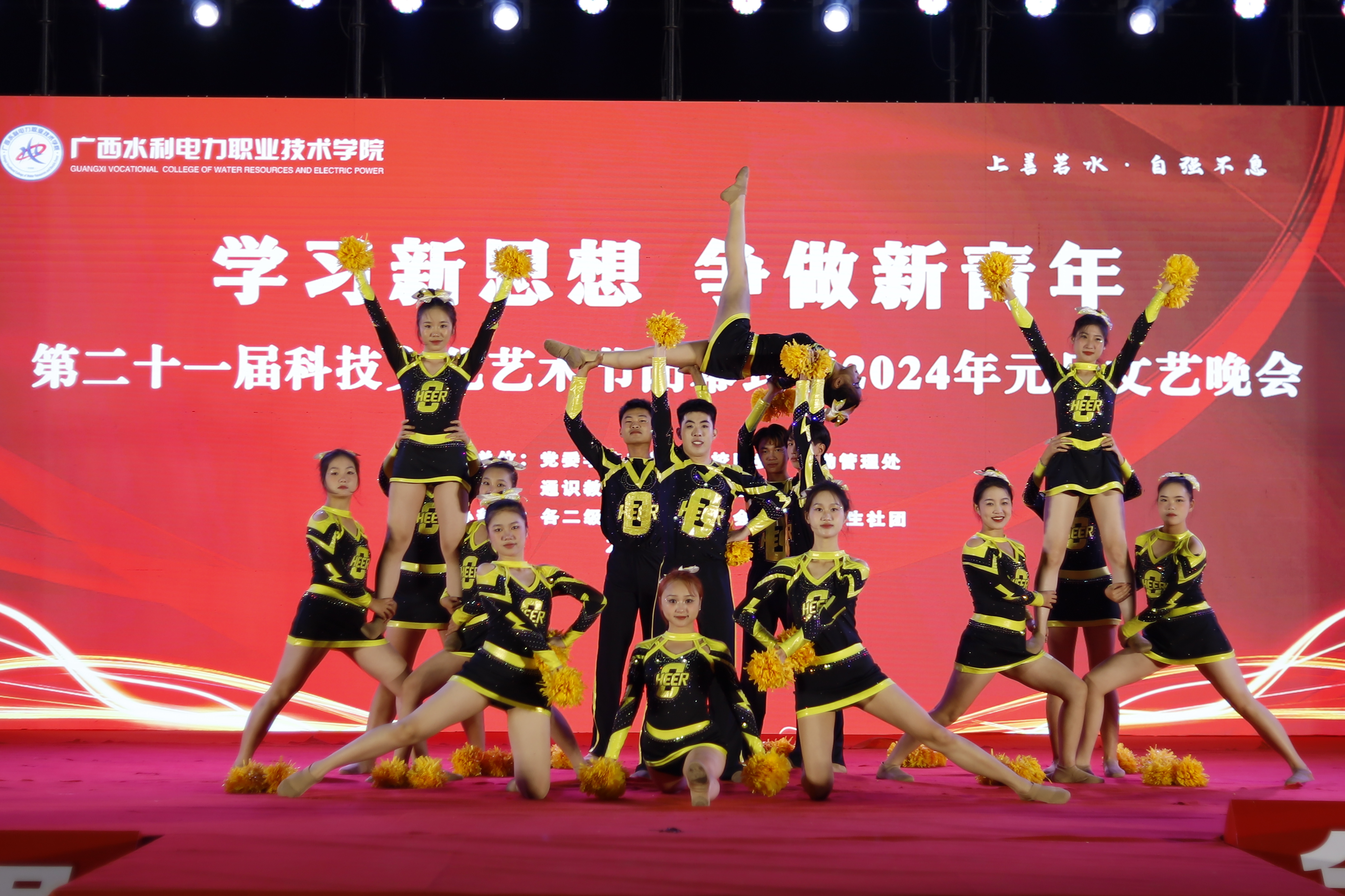 晚会分为《重引领,强底气》《创品牌,领风气》《树典型,扬正气》《提心气,聚朝气》四大篇章。晚会在学校龙狮协会的《龙腾盛世,国富民安》节目拉开序幕,第一篇章展现了近年来学校持续深入培育和践行社会主义核心价值观,强化文明培育、文化实践和品牌创建,厚植文明沃土,涵养时代新风。第二篇章在《“静湖之星”十佳大学》获奖代表风采展示中开启,伟德大学生体育舞蹈协会带来的节目《全民规定健美操》《集体花球自选动作》和南宁师范大学体育学院的《小团体技巧自选动作》啦啦操节目,展示了新时代青年学生的青春活泼、积极向上的精神风貌和独特魅力,通识教育学院的《走进数学建模》知识课堂展示,体现了伟德全方位培养学生综合素质。 打造“一校一品”活动,持续开展“科技校园文化艺术节”、校园十大歌手比赛、红歌比赛、诵读大赛、篮球精英赛等活动,不断激活水电师生创作积极性和参与性,学校一系列精神文明创建活动百花齐放、成风化人、引领风尚。第三篇章里马克思主义学院的《乡村振兴战略视角下广西桂林毛竹山村的现状调查》情景解说、社会实践成果展示、校友之约《广西青年爱广西》等节目,展现了水电师生“自强不息”的奋斗姿态,常态长效开展先进典型、道德模范等选树培育、学习宣传,广泛展现了先进典型迎难而上的勇气、主动作为的志气、开拓创新的锐气。第四篇章由后勤管理处以及物业工作人员带来的《绿色环保时装秀》、广西经济职业学院的歌伴舞《奔跑的青春》、广西制造工程职业技术学院的独唱《我在人民广场吃炸鸡》、广西幼儿师范高等专科学校的群舞《美丽的壮锦》,多校学生共同精彩亮相,带来精彩纷呈的节目。