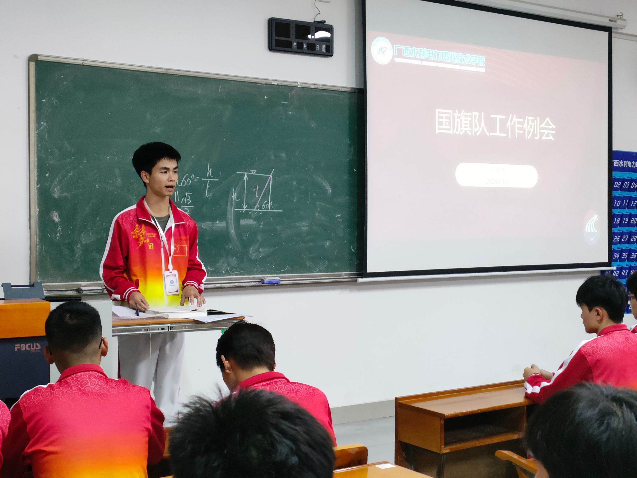 刘紫微以“国旗在我心中”为主题为全体队员上了一堂生动的“微党课”,号召队员们学以致远,不负韶华,做社会主义建设接班人。刘紫微在会议上主要就新学期国旗队近期工作安排及具体要求进行了明确,强调:一是思想上牢固树立正确的世界观、人生观和价值观,要把学习作为第一要务不要有丝毫的松懈。二是工作上各部门要分工明确,各司其职。三是训练中要科学施训,循序渐进,安全第一的理念,以练好练优为目的。四是作风上各位队员要严格要求自己,充分展现国旗队成员的精神风貌。