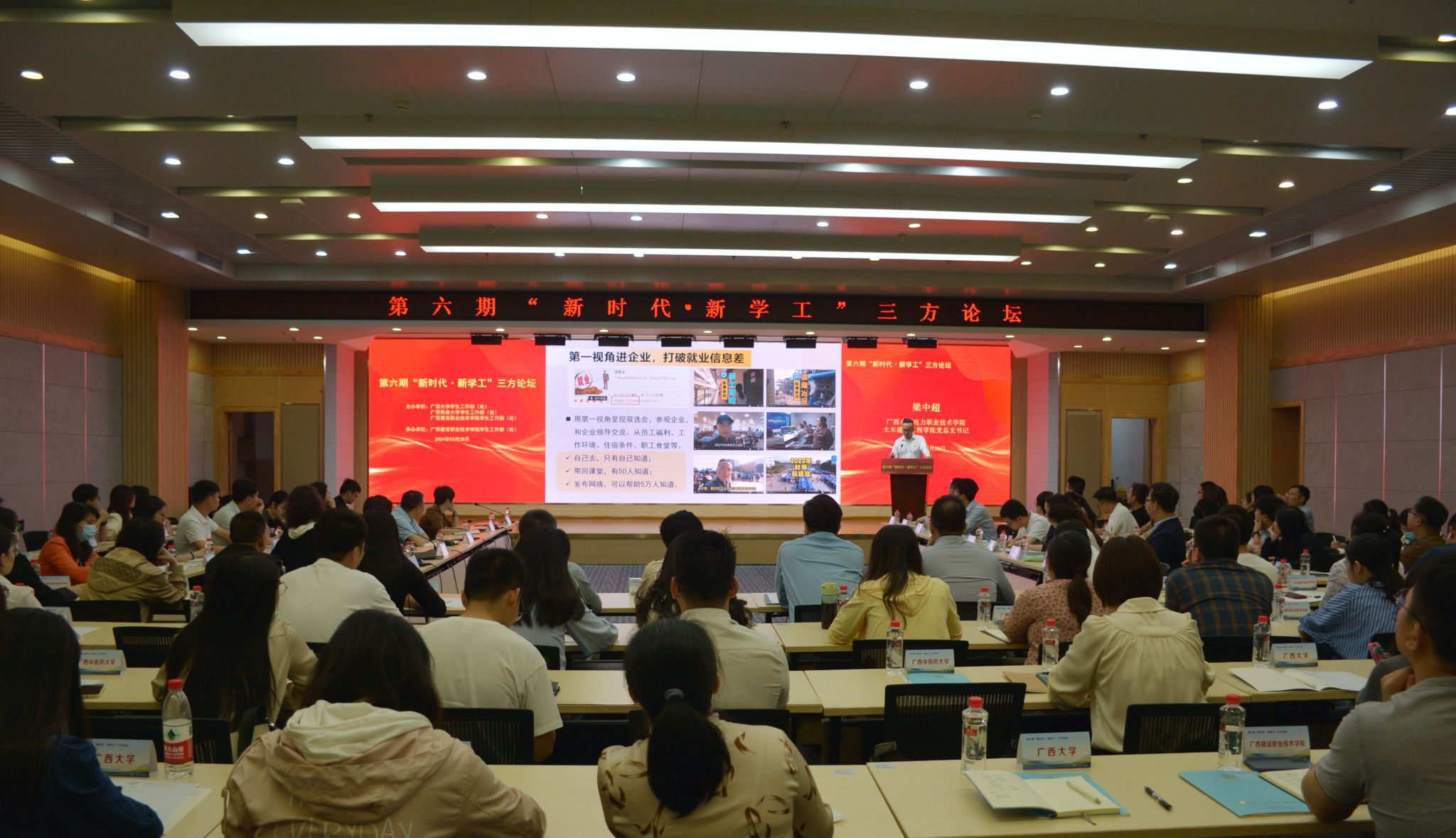 [本网讯]为搭建学习共同体平台,促进学校辅导员队伍专业化、职业化发展,3月28日,党委学生工作部受邀参加广西大学、广西民族大学、广西建设职业技术学院举办的“新时代ž新学工”三方论坛。活动由党委学生工作部部长李晓红带队,20余名辅导员参会。