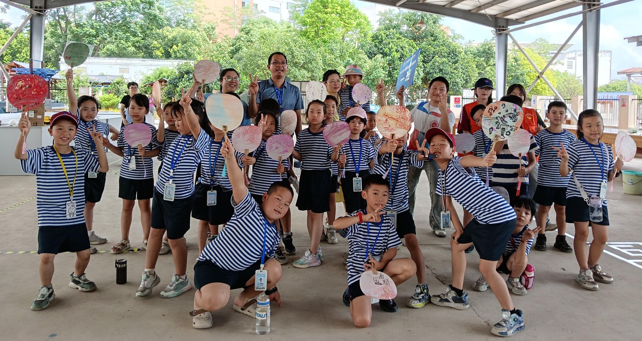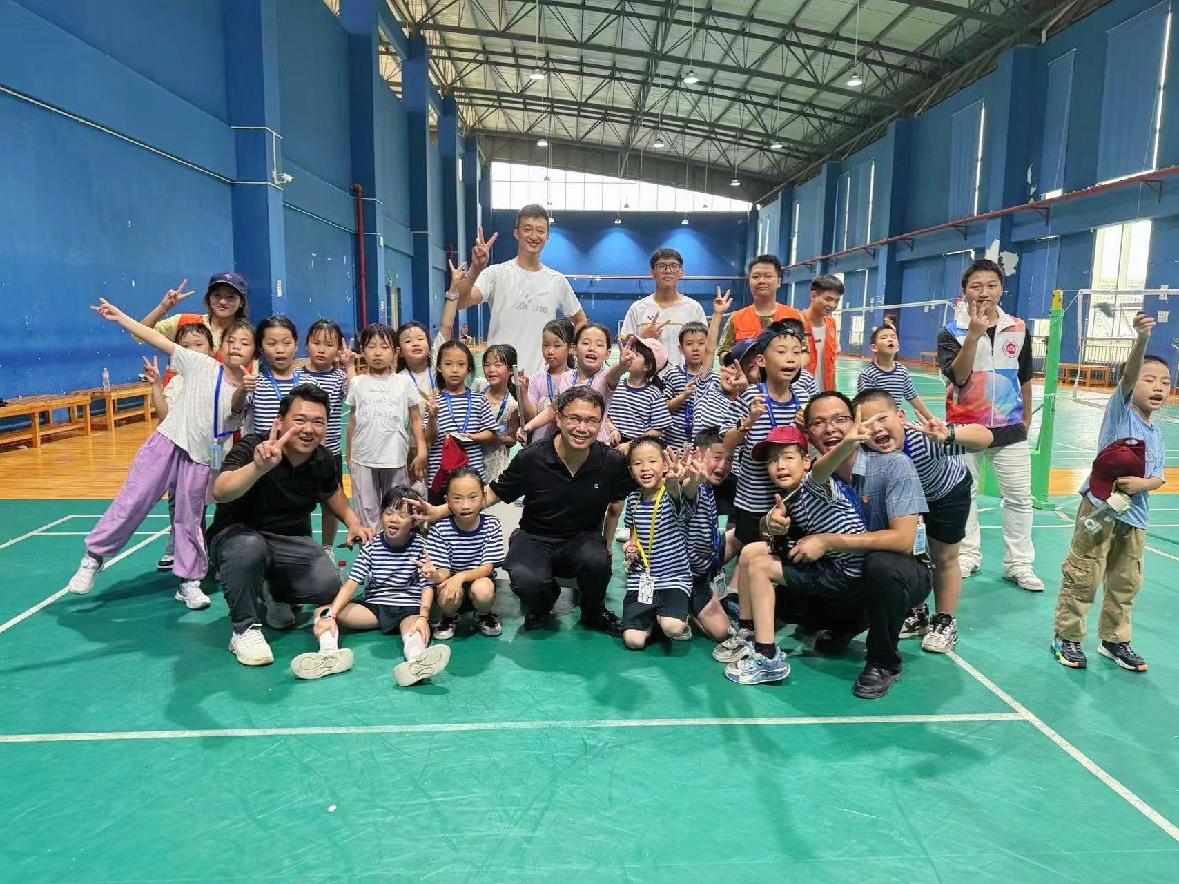 学校校长刘存香与研学的中小学生一起锻炼