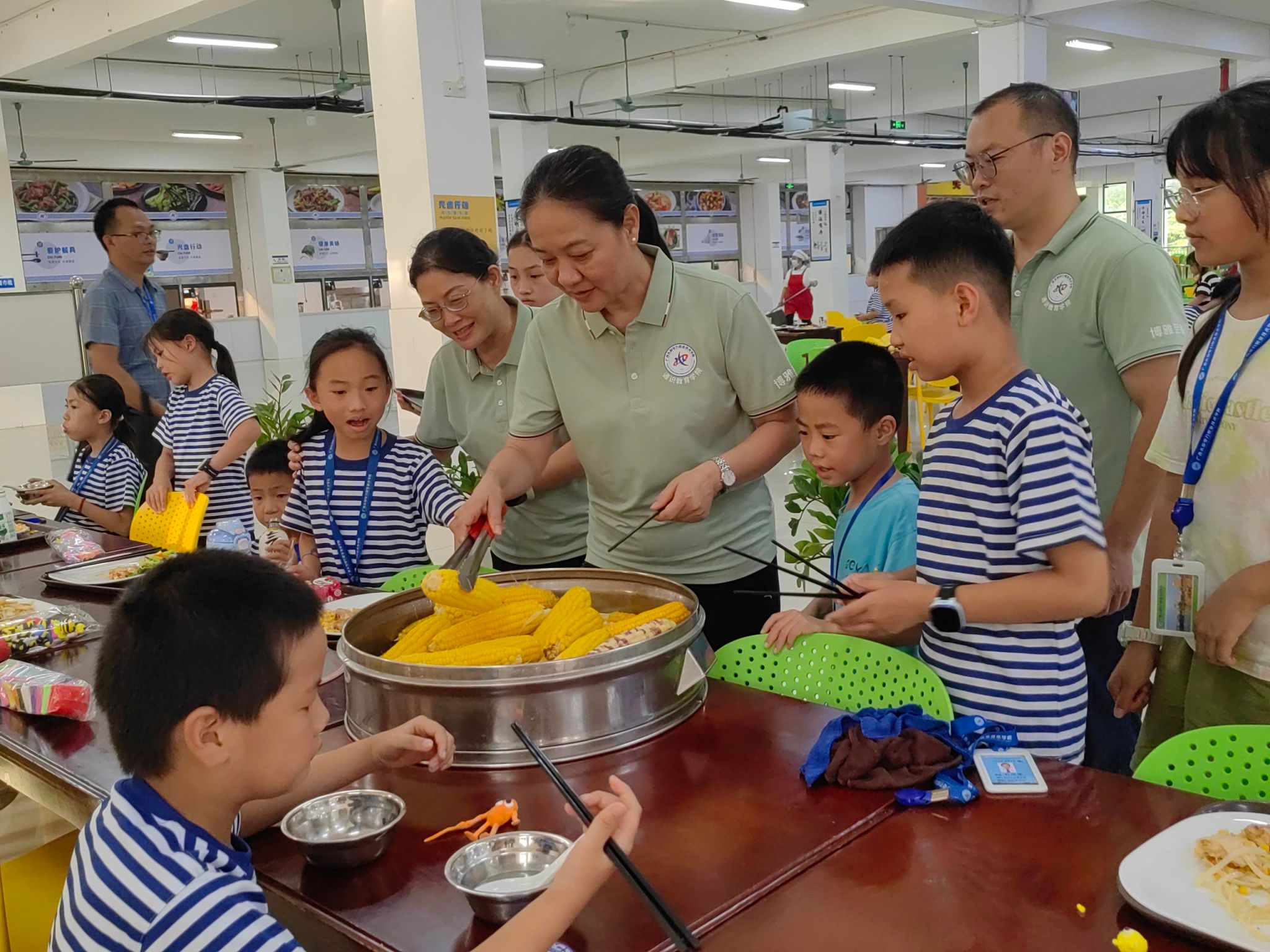学校党委副书记莫海燕为研学的中小学生分餐
