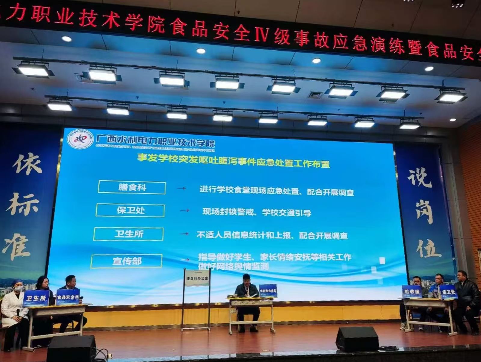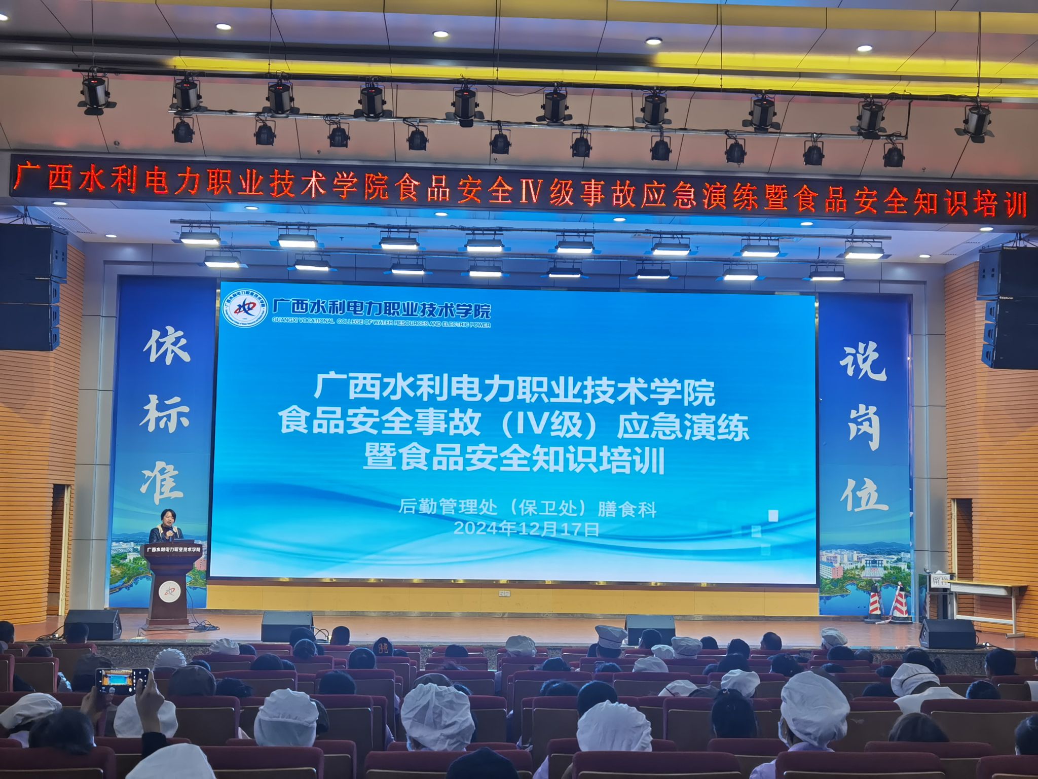 [本网讯]为进一步提高学校食品安全突发事件应急处置能力,最大限度减少食品安全事件发生,推动食品安全“两个责任”落地落实。12月17日下午,学校后勤管理处膳食科在里建校区青年之家开展2024年食堂食品安全事故IV级应急演练暨食品安全培训。后勤管理处(保卫处)副处长韦素娟出席活动,知味轩、惜谷轩食堂工作人员共300余人参加观摩演练。