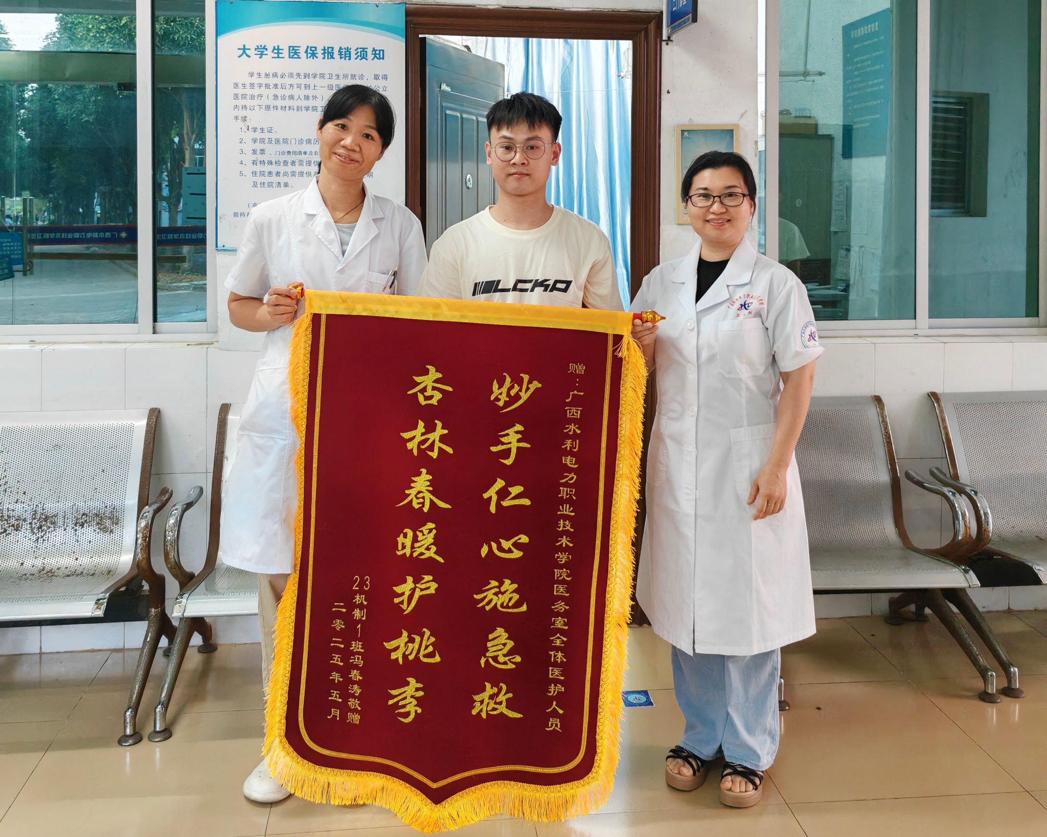 [本网讯]5月12日,在第114个国际护士节当天,学校后勤管理处卫生所收到了一份饱含深情的节日礼物—来自机电工程学院23级机制一班冯春涛同学赠送的锦旗。