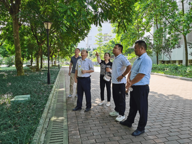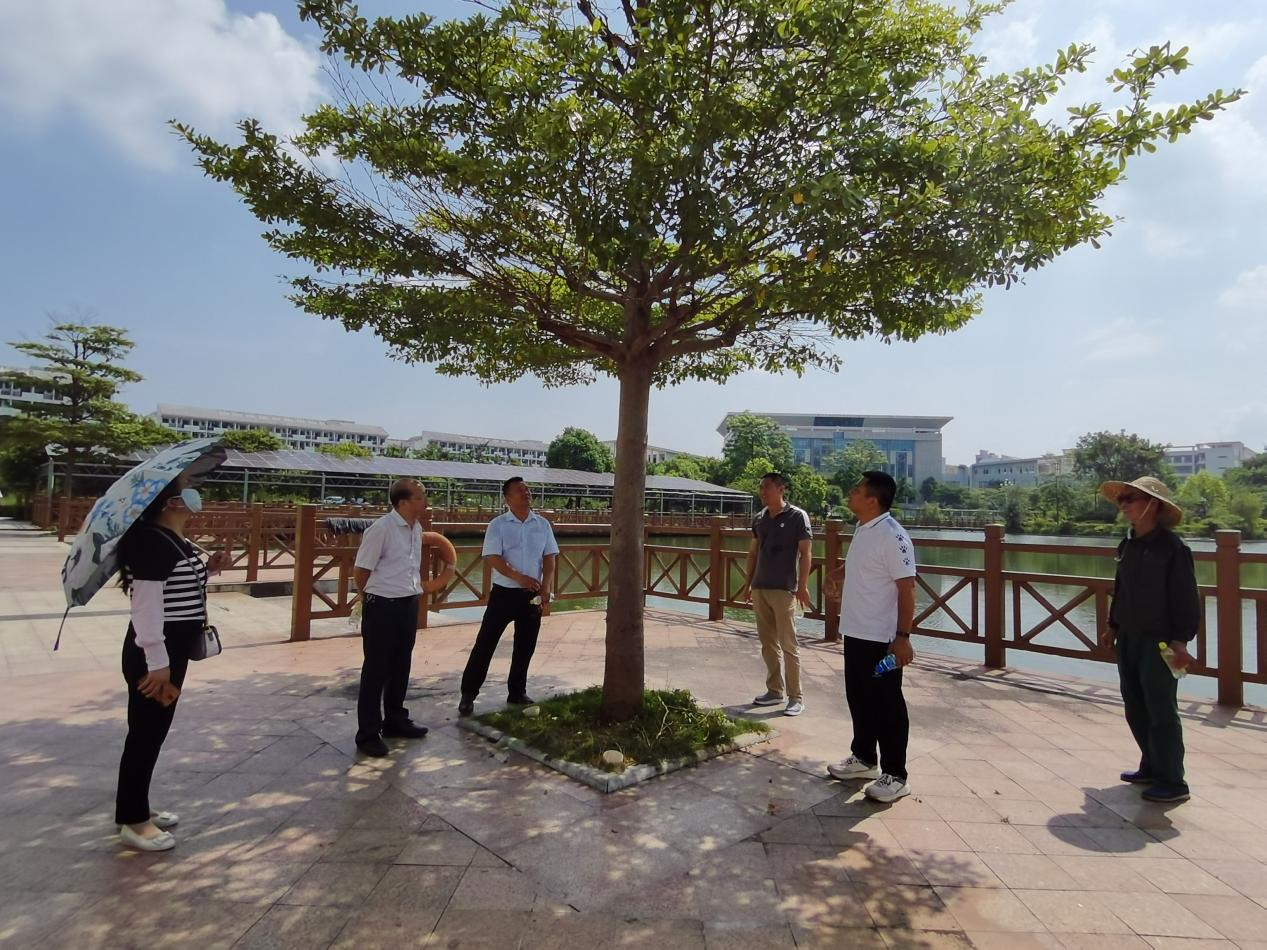 [本网讯]7月25日上午,后勤管理处(保卫处)行政督导蔡平强带领后勤相关工作人员、军之港物业有限公司负责人、广西景丽达园林绿化有限公司何专家共同巡查里建校区绿化带。蔡平强督导就绿化带的树木花草出现枯黄、受病虫害、难生长、难成活的现象提出疑问,何专家听后现场给出建议与办法。