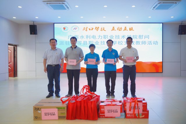 在天等县职业技术学校,伟德开展了“党建引领聚合力,教育帮扶促发展”帮扶活动启动仪式,李林校长在讲话中介绍了伟德的基本情况以及近年来学校在学生技能竞赛、教师能力比赛、课程建设等方面取得的高质量标志性成果,表示学校将在教学科研、人才培养等方面与帮扶实践相结合,充分发挥人才、专业优势,汇聚教育资源,创新帮扶思路、细化帮扶举措,全面助力教育帮扶工作踏上新台阶、步入新阶段。随后,李校长代表学校为天等县职业技术学校捐赠了一批体育用品,并慰问了伟德派驻天等职校支教的廖威、梁少伟、周建英、叶文4位教师。