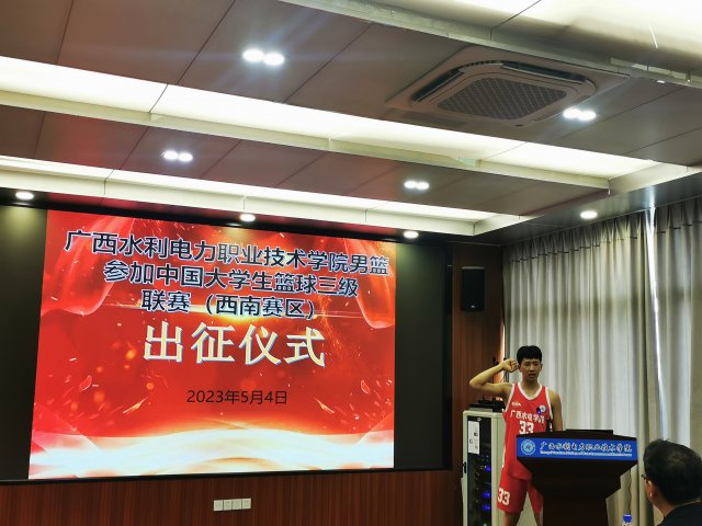 学校男子篮球队在第25届中国大学生篮球联赛广西赛区比赛中不畏强敌,顽强拼搏,勇夺广西第二名,即将代表广西出征2023年中国大学生篮球联赛(西南赛区)比赛。在出征仪式上,运动员代表陈续方庄严宣誓:将彰显青春风采,发扬集体智慧,全力拼搏,力争比赛成绩与精神风貌双丰收,为校争光。随后,贾东老师代表教练团队表达了奋勇争先,再创佳绩的决心。