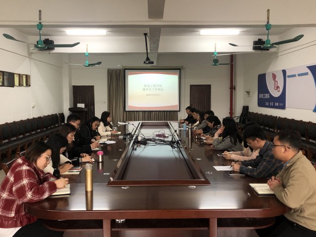 [本网讯]为夯实新学期学生管理各项工作,进一步加强学生安全教育,认真落实班会制度,机电工程学院于3月3日下午召开了辅导员工作例会,学院党总支书记杨青以及全体专兼职辅导员参加了会议,会议由杨青书记主持。