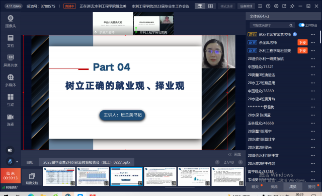[本网讯]为做好2023届毕业生就业指导工作,引导和帮助2023届毕业生认清就业形势,了解就业政策,转变就业观念,积极主动求职就业,2月27日晚,水利工程学院在线上直播召开2023届毕业生就业教育报告会,本次会议由就业干事罗荣慧老师主持,余金凤院长、班兰美书记、毕业班辅导员和毕业班700多名学生参加。