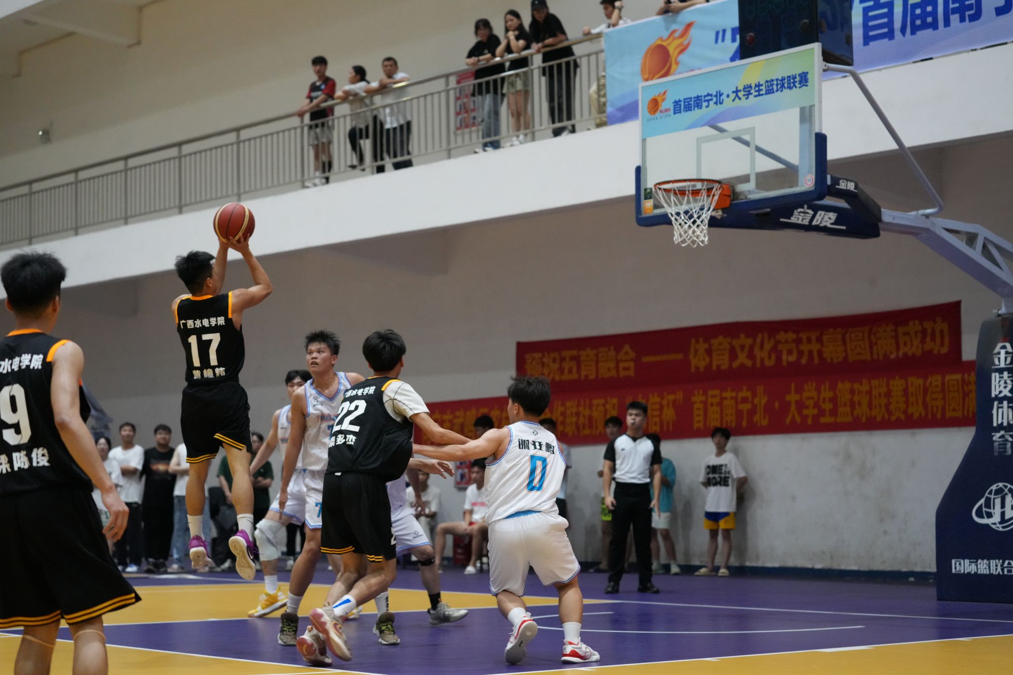 [本网讯]5月22日,由南宁市南宁教育园区规划建设现场指挥部、南宁市武鸣区人民政府、广西-东盟经开区管委会共同主办,伟德协办的“农信杯”首届南宁北·大学生篮球联赛在学校里建校区火热开赛。学校党委副书记侯宗毅、学校财务处处长梁玉莲、通识教育学院院长韦弘、学工处副处长杨骏、后勤处(保卫处)副处长肖翔等领导亲临现场观看比赛,为选手们加油鼓劲。
