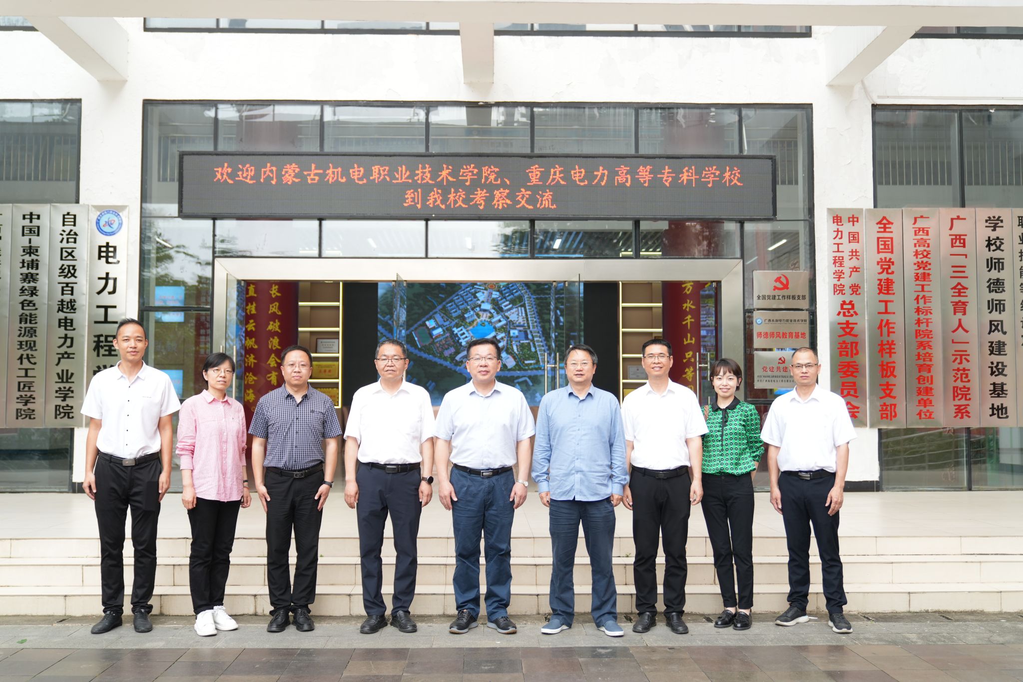 内蒙古机电职业技术学院党委书记呼和一行和重庆电力高等专科学校校长宗伟一行首先到电力工程学院参观交流。李林对兄弟院校的到来表示热烈欢迎,就学校发展历史、教学工作、学科建设、师资队伍、人才培养等方面进行了详细介绍;随后,参观了电力工程学院施耐德绿色能源基地、启梦大厅、工匠长廊和实训基地、汽车工程学院理想汽车售后服务实训基地、土木建筑学院廉政教育基地、水利工程学院实训基地和实训楼仿真基地,以及“一站式”学生社区。