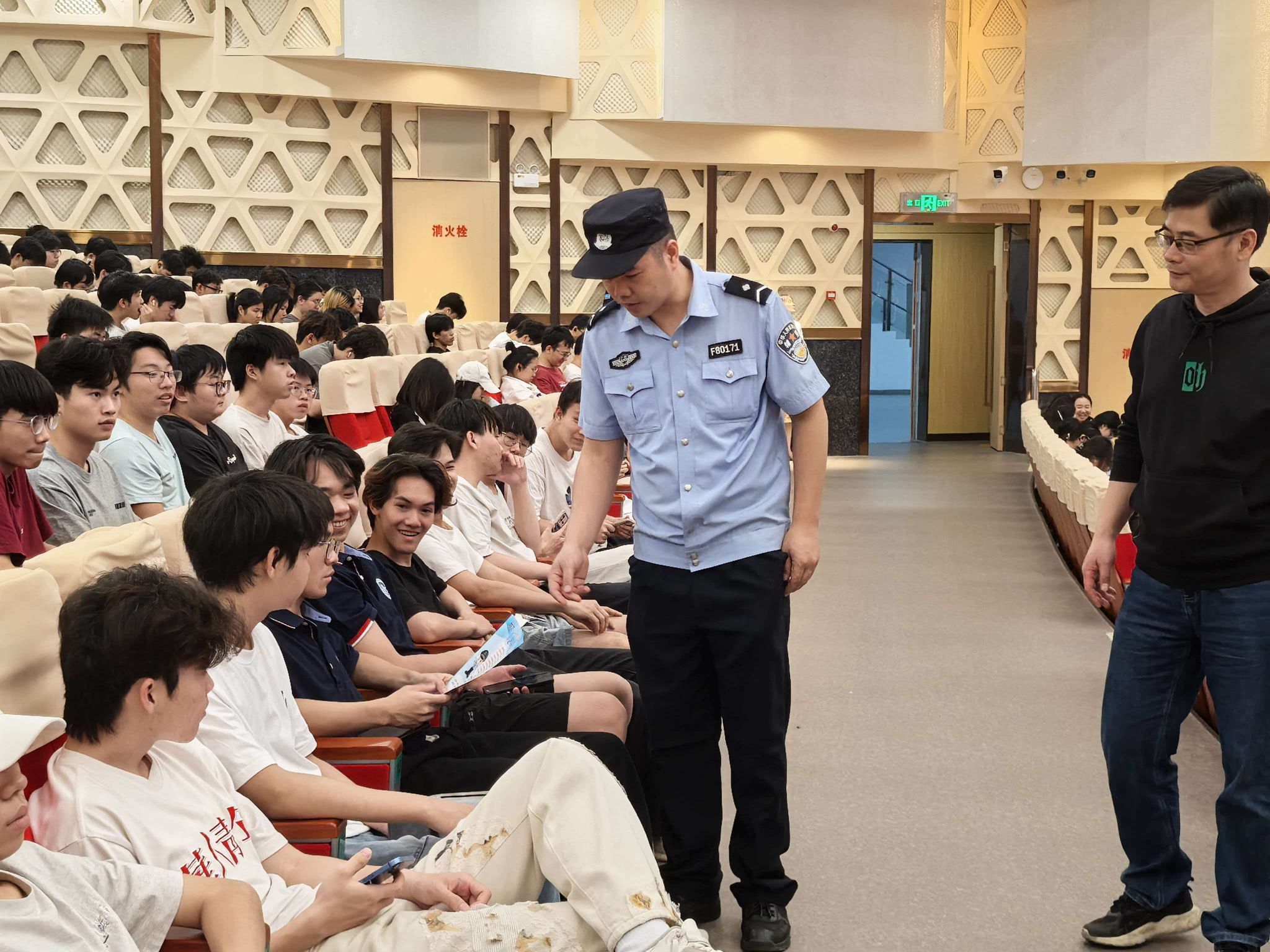 讲座邀请南宁市公安局东盟分局里建派出所民警张朝锋担任主讲。针对大学生群体易受骗的刷单返利、冒充客服、虚假交易等类型,张警官结合真实案例深入剖析,通过沉浸式互动教学,让学生在家门口掌握识诈、防诈技巧。还指导学生下载注册“国家反诈中心”APP,现场气氛热烈。