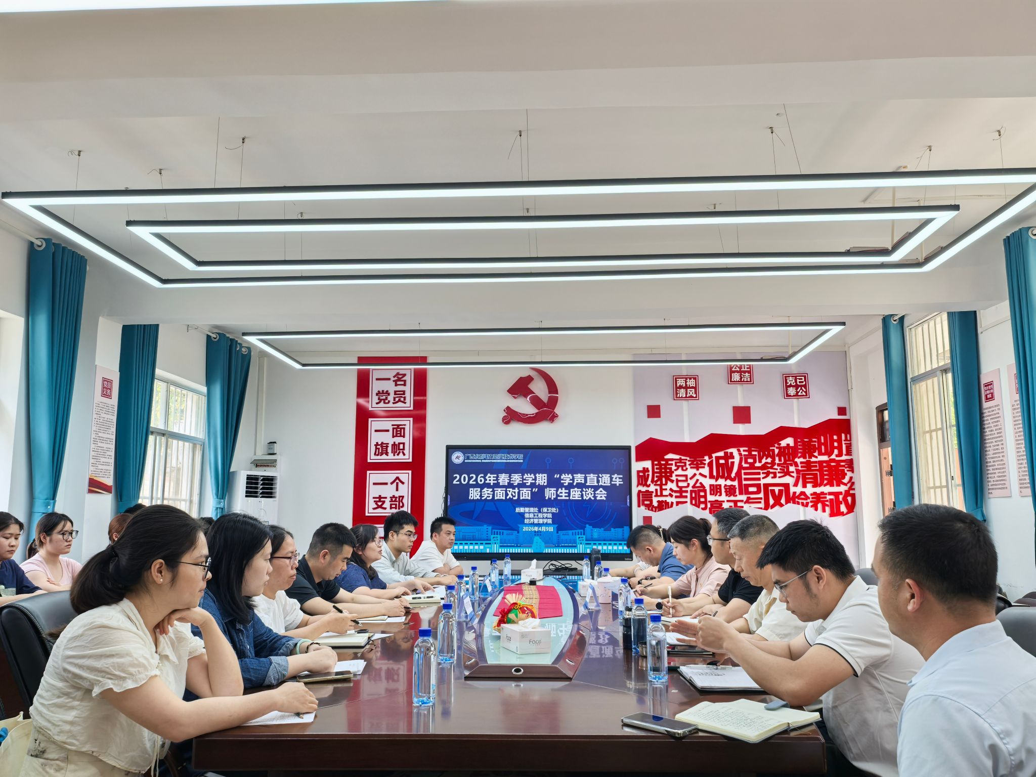 座谈会上,各二级学院师生代表结合前期收集的师生意见,围绕校园安全管理、宿舍设施维修、食堂餐饮品质、校园环境优化及水电服务保障等学习生活热点问题踊跃发言,提出了若干具体意见和建议。相关科室及两校区物业、食堂、节能服务等第三方单位负责人认真倾听、逐一记录,并对同学们提出的问题进行了细致回应与解答。