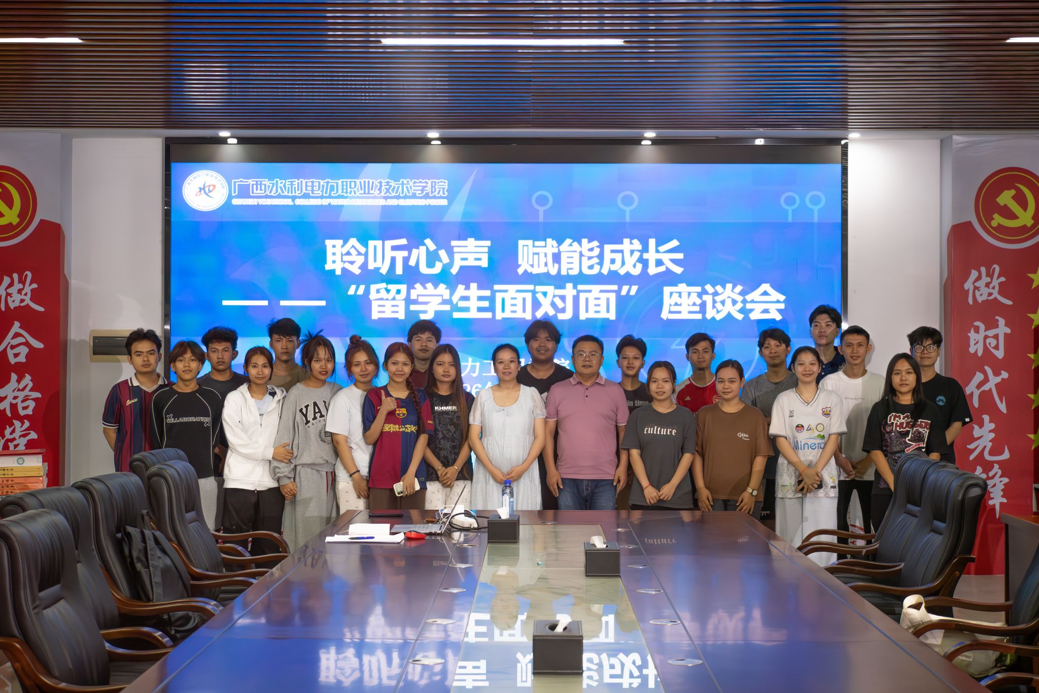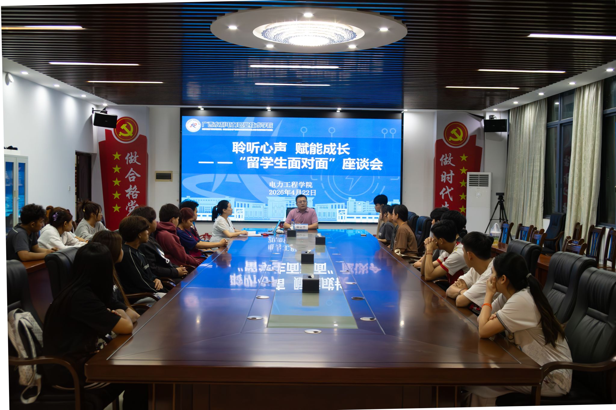 [本网讯]为积极服务“一带一路”倡议,全方位关爱留学生在华学习与生活,助力其成长为具有跨文化视野和专业胜任力的国际化人才,4月22日晚,电力工程学院在里建校区电力实训楼A206党员活动室举办了“聆听心声 赋能成长”——“留学生面对面”座谈会。学院副院长张宗华、留学生辅导员赵丹出席活动,学院2023级、2024级全体留学生参加座谈。