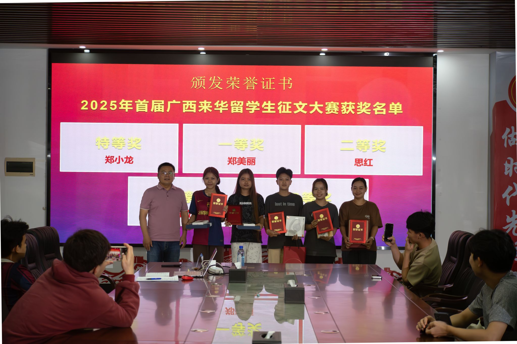 随后,张宗华为在2025年首届广西来华留学生征文大赛中获奖的同学颁发了奖品,并勉励他们珍惜荣誉、再接再厉,用文字和行动讲好中国故事、传播友好声音。