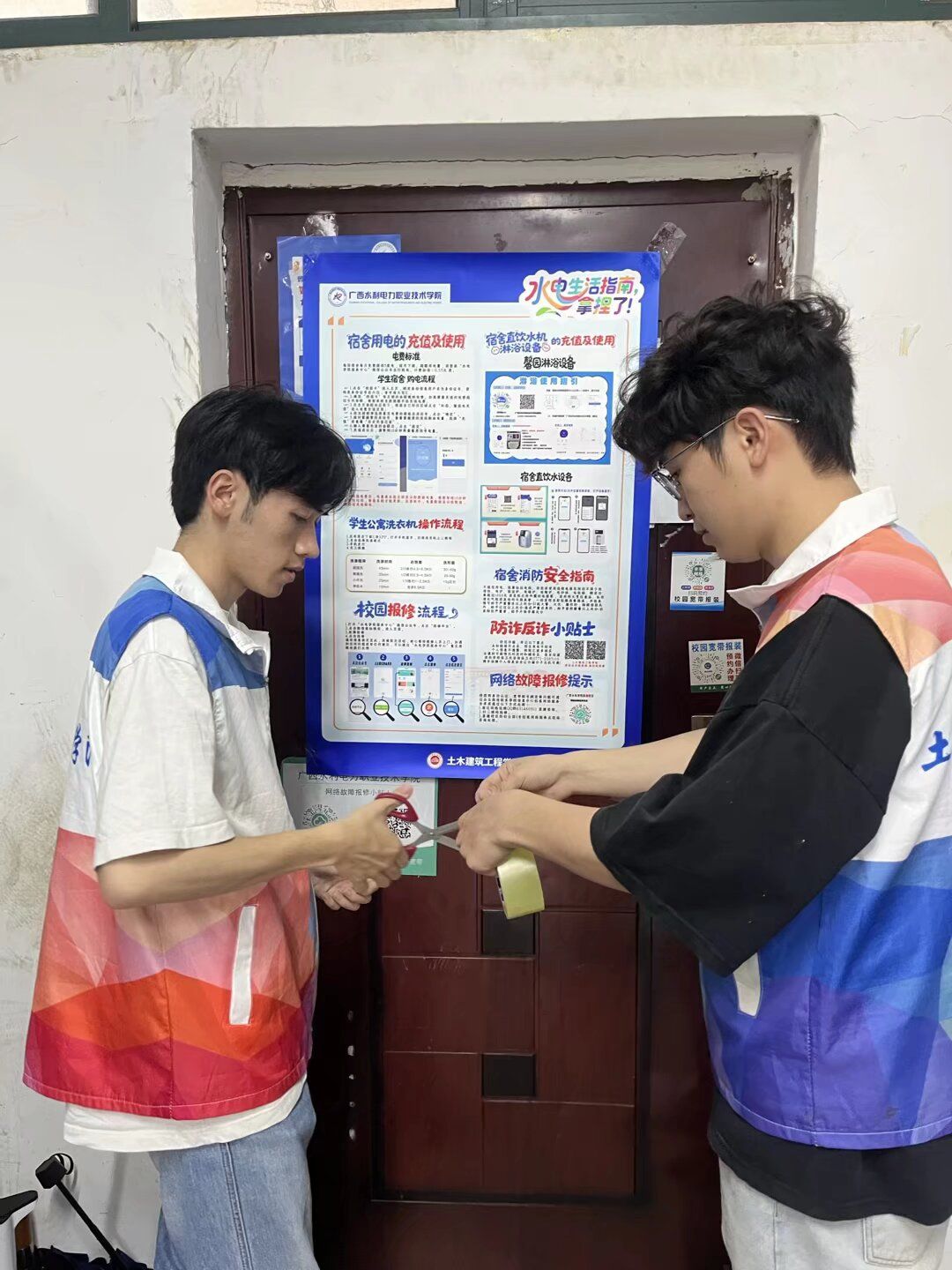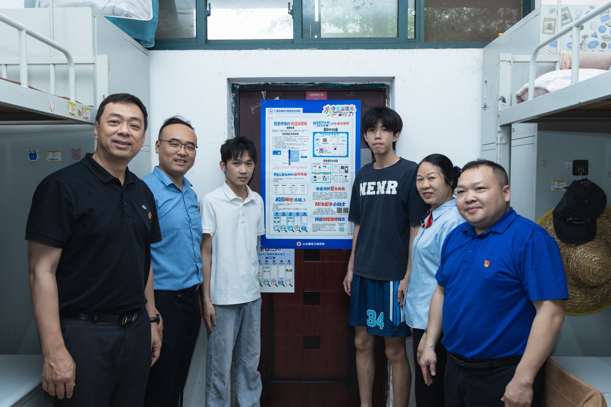 部门领导、学院领导、宿舍管理员共同深入宿舍张贴水电生活指南海报