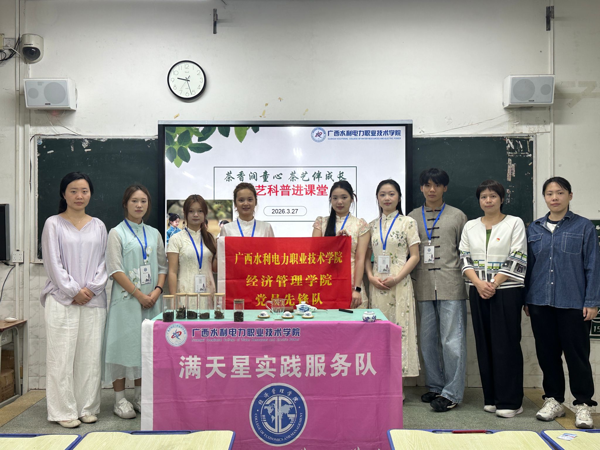 [本网讯]3月27日,南宁师范大学附属实验学校的课堂茶香袅袅、童趣盎然。经济管理学院“双带头人”教师党支部书记“强国行”专项行动团队、学生党支部、学院团委联合茶艺协会,共同开展“茶香润童心 茶艺伴成长”茶艺科普进课堂志愿服务活动。学院党员教师、学生团员及青年学生积极参与,以茶为媒,将传统文化与志愿服务深度融合。