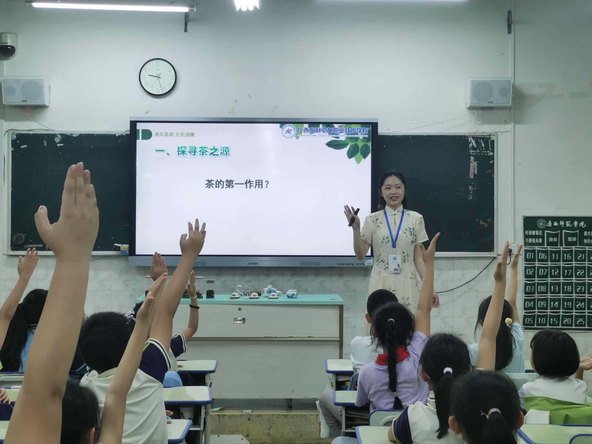本次40分钟科普课堂由茶艺协会学生陈慧灵主讲,围绕茶文化、茶品类、茶艺体验、识茶品茶四大内容展开,理论讲解与互动实践有机结合。课堂上,陈慧灵生动讲述茶文化的起源与发展,带领孩子们认识绿茶、红茶、乌龙茶等常见茶类;通过实物辨茶、刮画创作、品茶体验等趣味环节,让孩子们在动手实践中感受茶的魅力,学习基本茶礼。