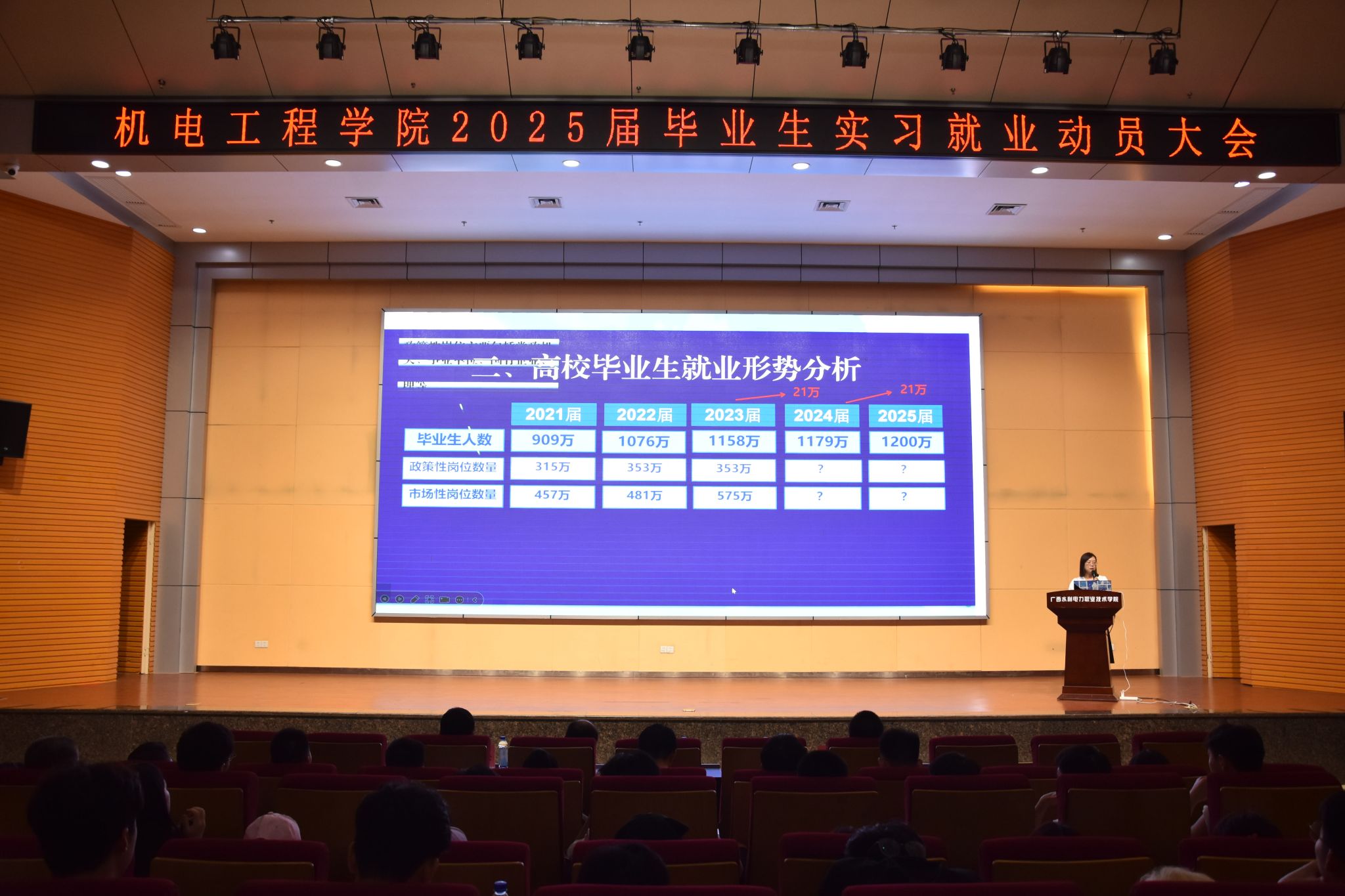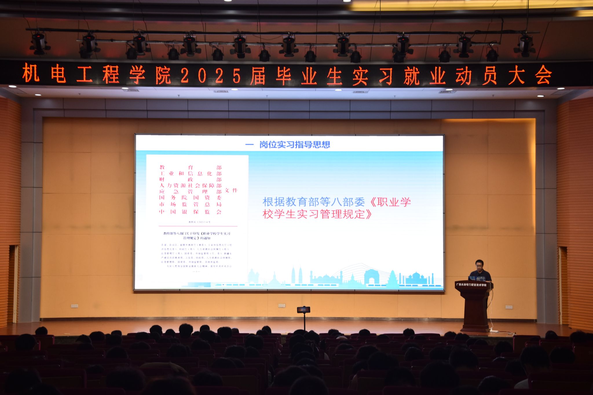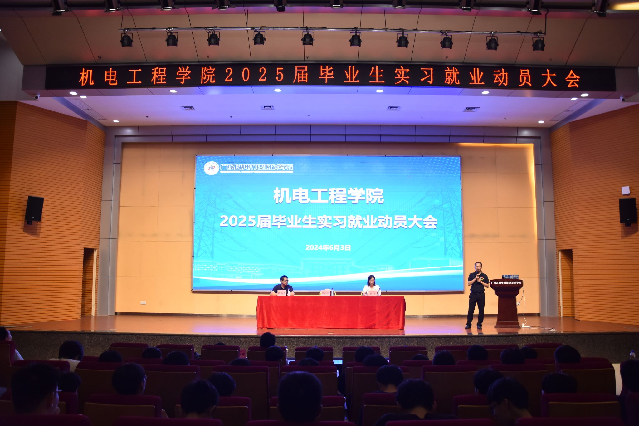 [本网讯]为积极引导2025届毕业生树立正确的择业观和就业观,提高就业积极性和主动性,高质量推动岗位实习及就业工作开展。6月3日晚,机电工程学院在里建校区召开2025届毕业生实习就业动员大会。机电工程学院院长陆尚平、党总支书记杨青、副院长陈韶光、各专业负责人、2025届辅导员以及2025届毕业生约1200人参加会议,会议由“匠心志远”就业创业工作室负责人肖芬主持。