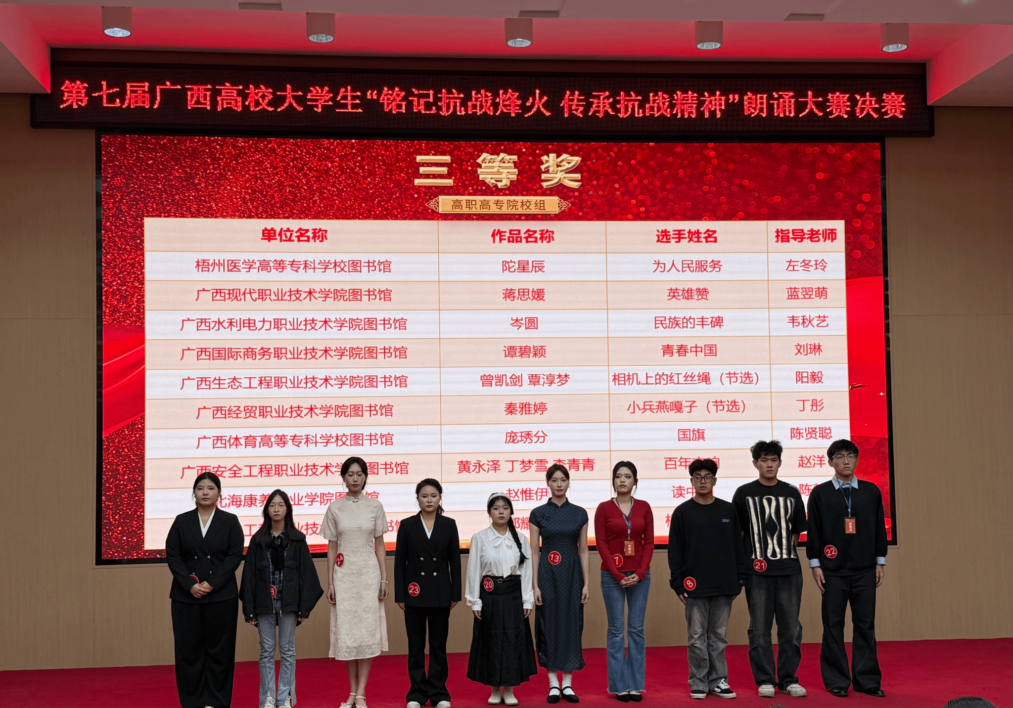 [本网讯]11月16日,第七届广西高校大学生“铭记抗战烽火 传承抗战精神”朗诵大赛决赛在南宁师范大学明秀校区文星楼301报告厅举行,共有19所高职高专院校的24个作品入围决赛,其中经济管理学院2024级大数据与会计2班岑圆同学凭借超高人气,以网络投票第一名的优异成绩入围决赛。