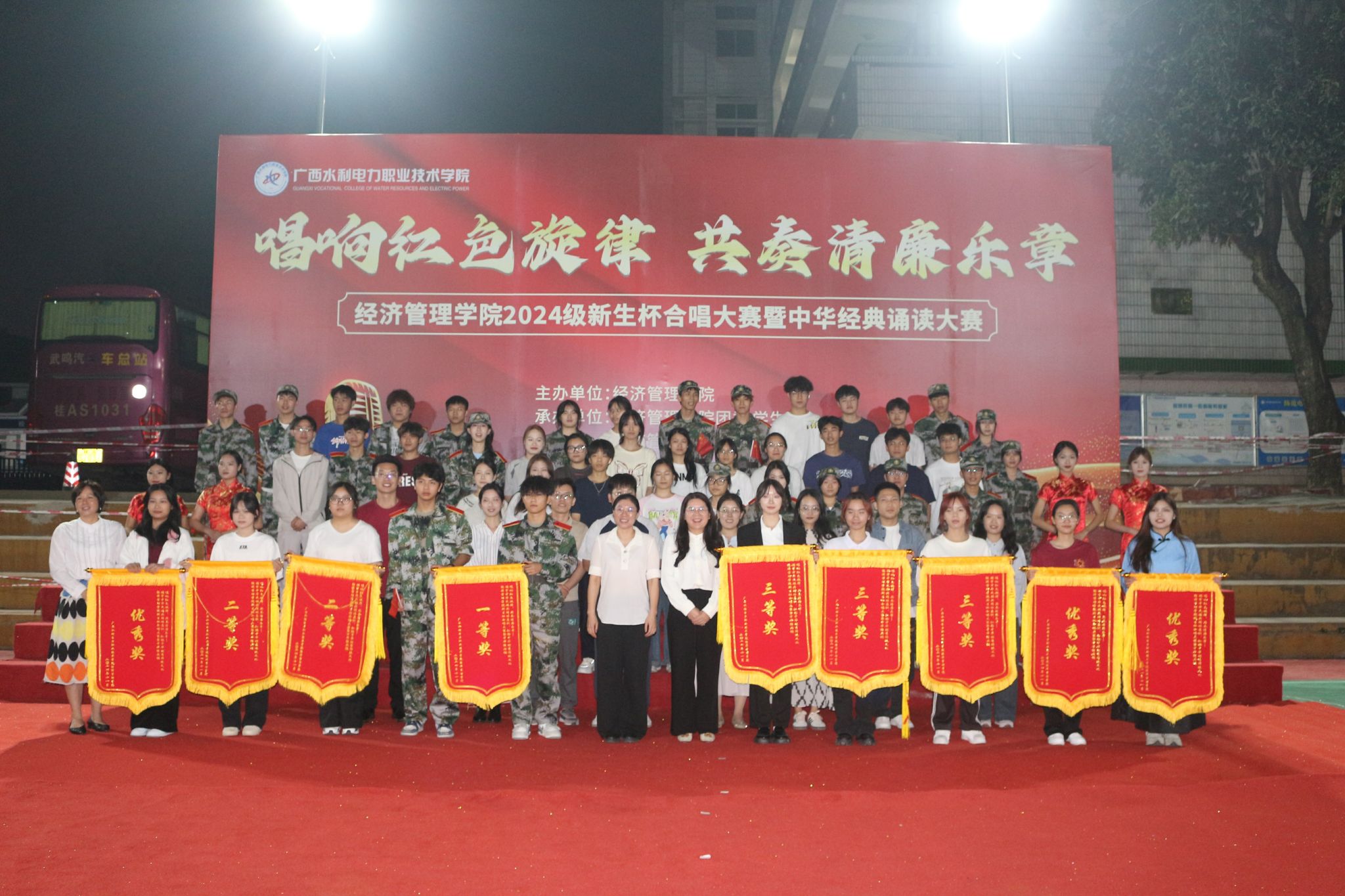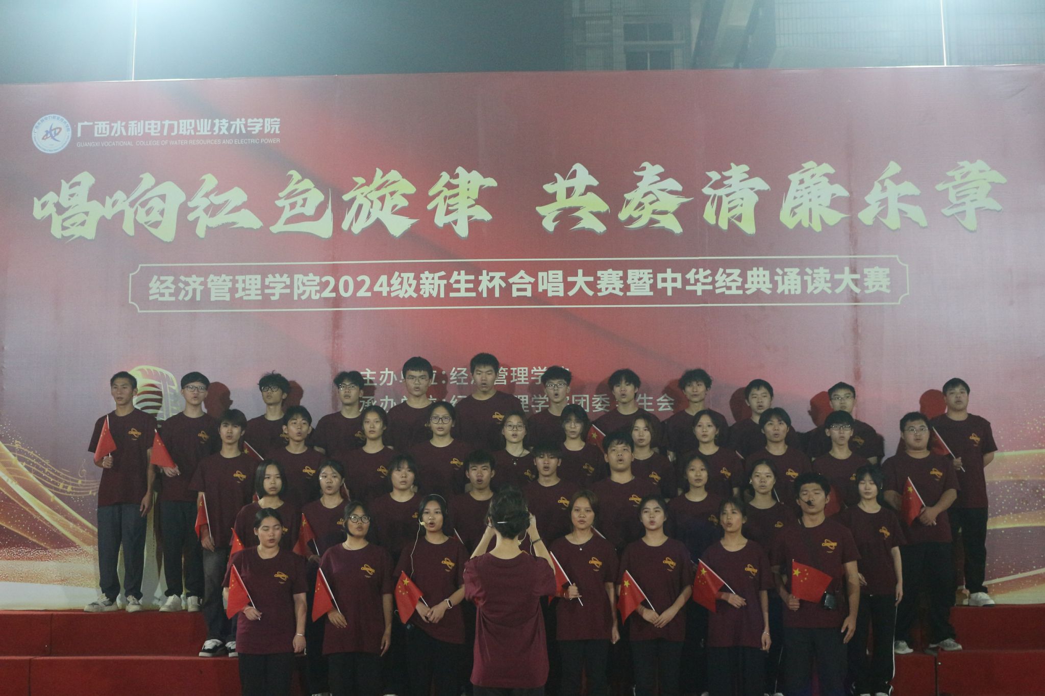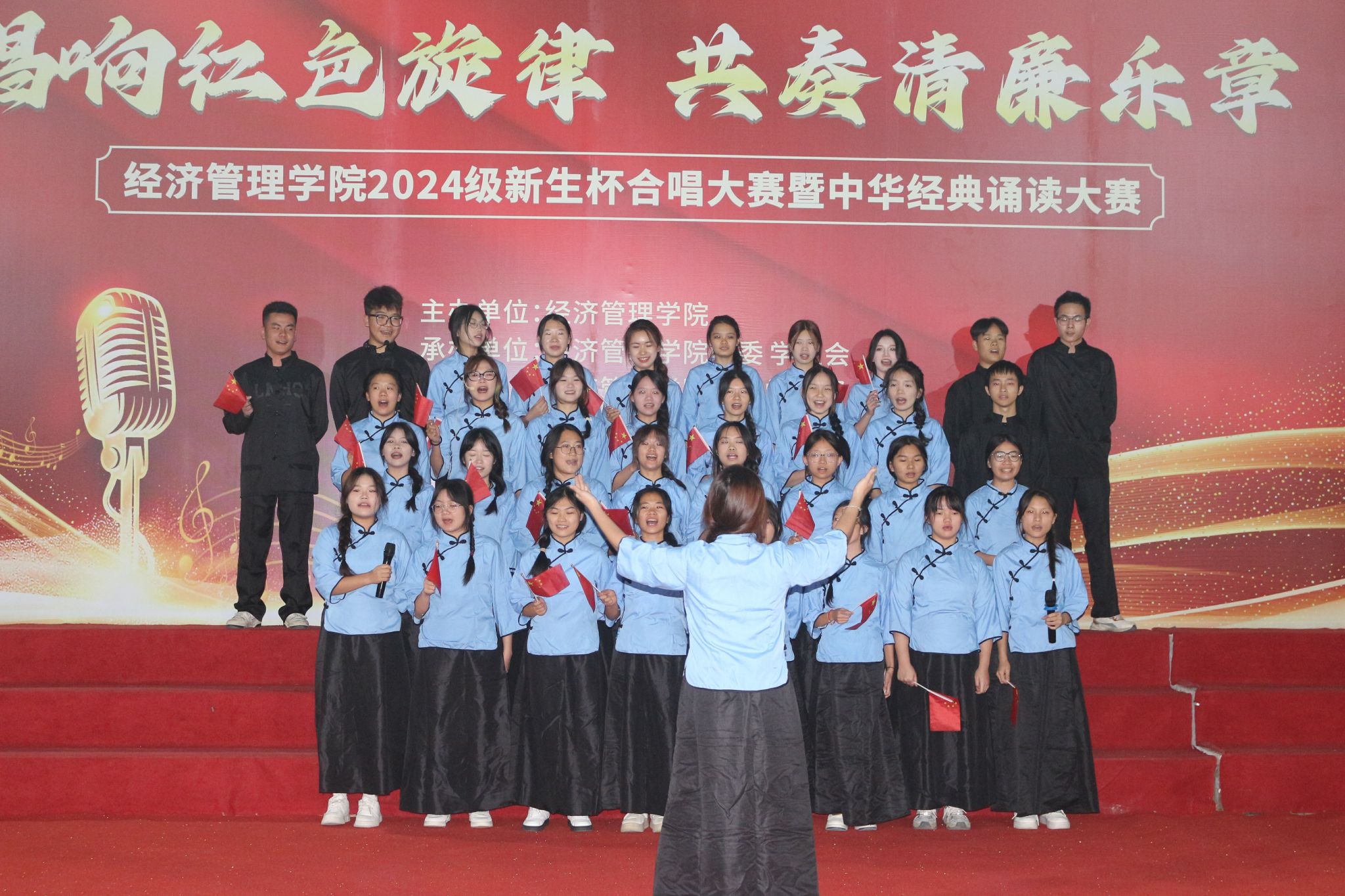 [本网讯]为热烈庆祝中华人民共和国成立75周年,弘扬爱国主义旋律,进一步激发青年学子爱党爱国爱社会主义的热情,凝聚青春力量,经济管理学院于11月3日在长堽校区开展“唱响红色旋律,共奏清廉乐章——铸牢中华民族共同体意识,弘扬中华优秀传统文化”2024级新生杯合唱大赛暨中华经典诵读大赛,旨在通过合唱展现新生的青春风采,弘扬团结协作精神,引导我院青年学子抒发爱国情怀,贡献青春力量。经济管理学院院长唐锋、党总支书记班兰美出席了本次活动,全体辅导员、班主任、2024级新生参加。