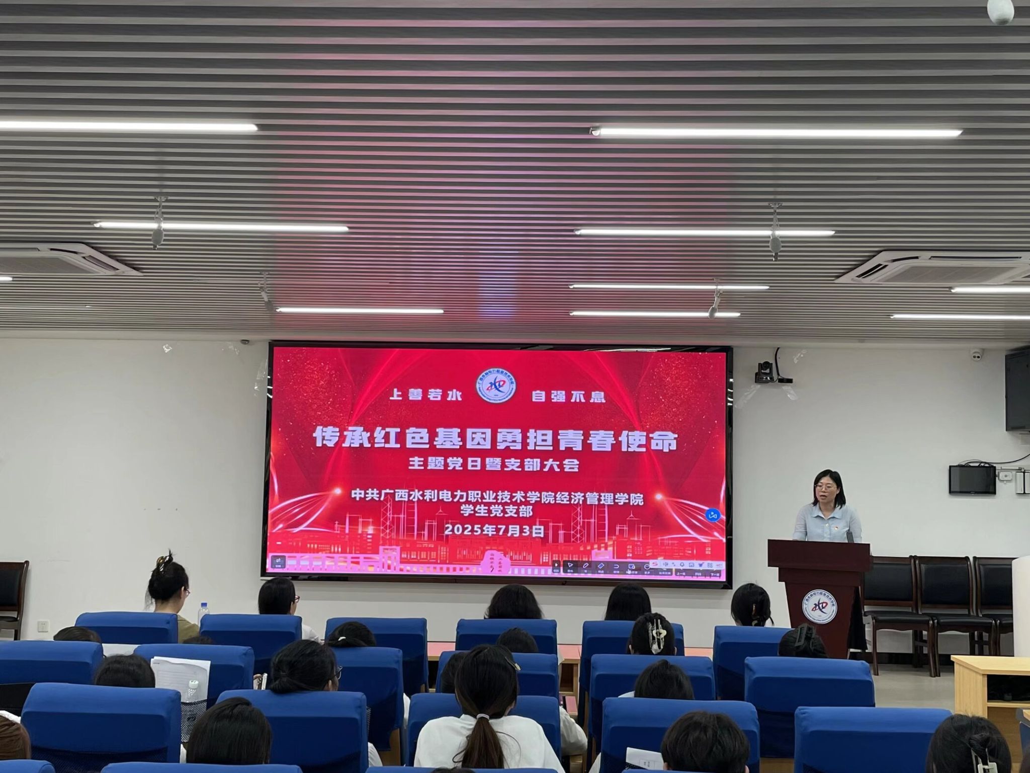 [本网讯]7月3日下午,经济管理学院学生党支部于四教1-5召开“传承红色基因,勇担青春使命”主题党日暨支部大会。学院党总支副书记、院长唐锋,学生党支部书记尹瑞麟,专职组织员李夏然以及昌海燕等11名党员教师受邀出席,22级12名正式党员、23级12名预备党员及24级70名入党积极分子参会,共同见证党组织发展进程,凝聚青春奋进力量。