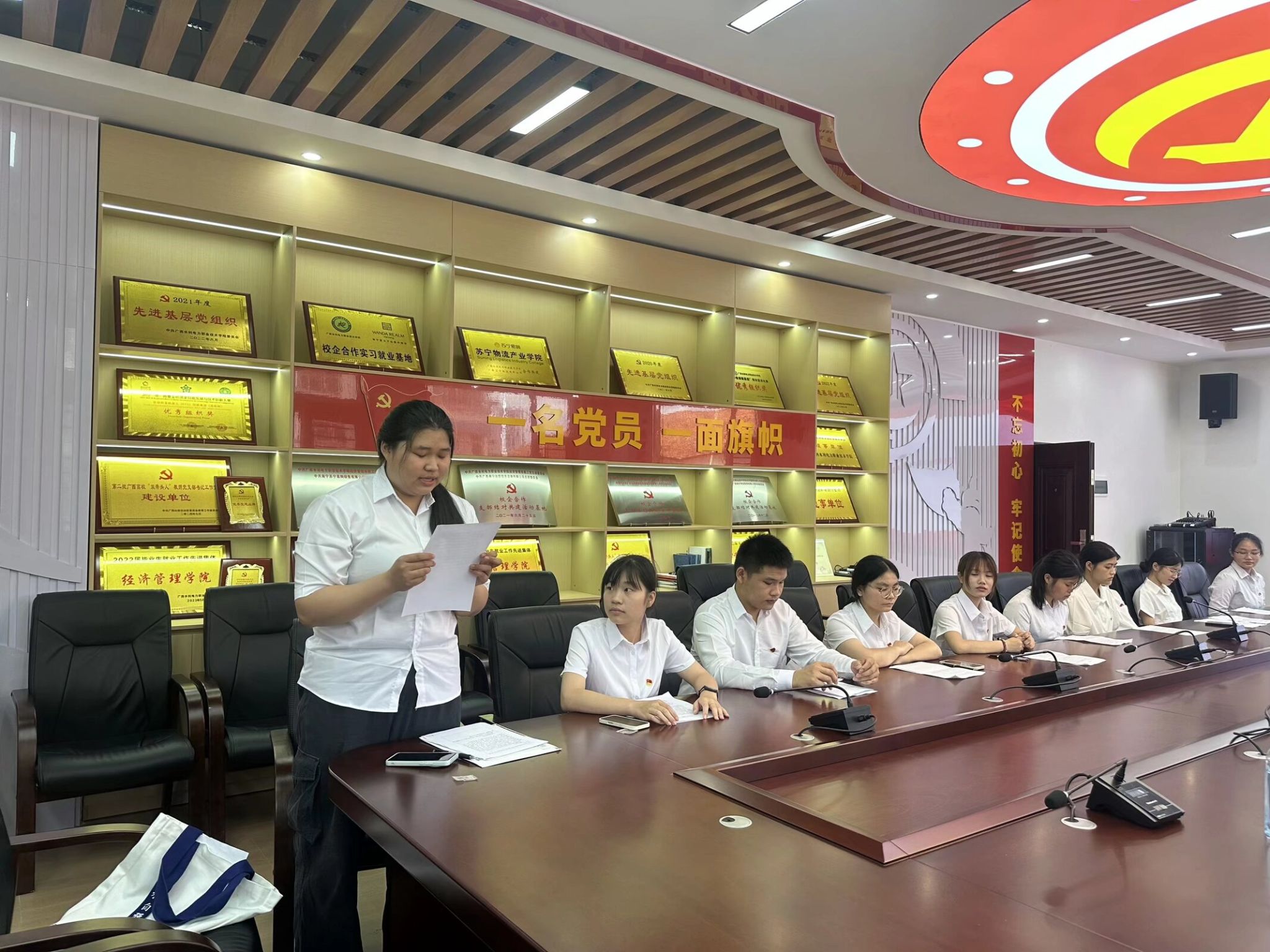 组织建设环节,组织委员祁拯宣读 24 级入党积极分子群团推优结果。经班级团支部推荐与党支部考察,韦成杰等70名学生获推优资格。学生代表发言时,表达了向党组织靠拢的坚定信念。随后,尹瑞麟同志宣读《关于同意接收万福才等12名同志为中共预备党员的批复》。老党员为新党员佩戴党员徽章后,全体人员起立,面向党旗,在唐锋同志领誓下庄严宣誓,铮铮誓言彰显使命担当。
