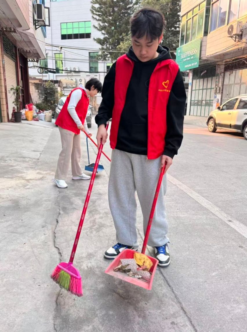 活动中,学子们化身雷锋精神践行者,身着红马甲清扫街道,以扫帚为笔,勾勒家乡整洁画卷;在社区搬运物资、整理物品,用汗水为群众活动筑牢保障;在医院自助机旁耐心引导,以细心服务传递温暖。无论是文明宣传、环境维护,还是便民帮扶,同学们始终以雷锋为榜样,将无私奉献融入点滴行动,在清扫街巷、搬运物资、服务群众的过程中,生动诠释雷锋精神的时代内涵。